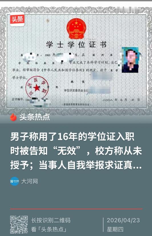 其实学位证这种东西,按理说应该是学校授予、学信网备案,一查一个准,怎么会出现用了16年才发现无效的情况呢?这里面到底是当年学校发放环节出了错,还是审核流程有漏洞,或者是其他什么原因,现在还不好说,得等官方核查结果出来才能知道。