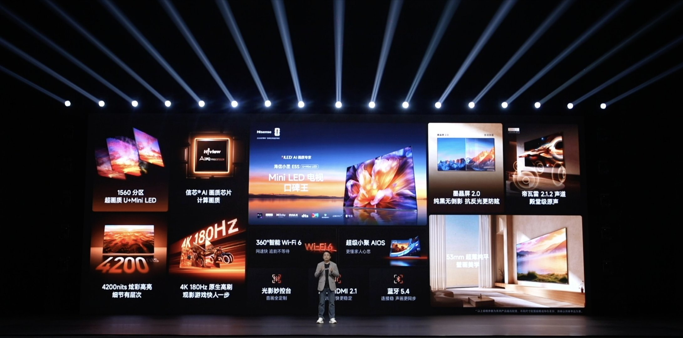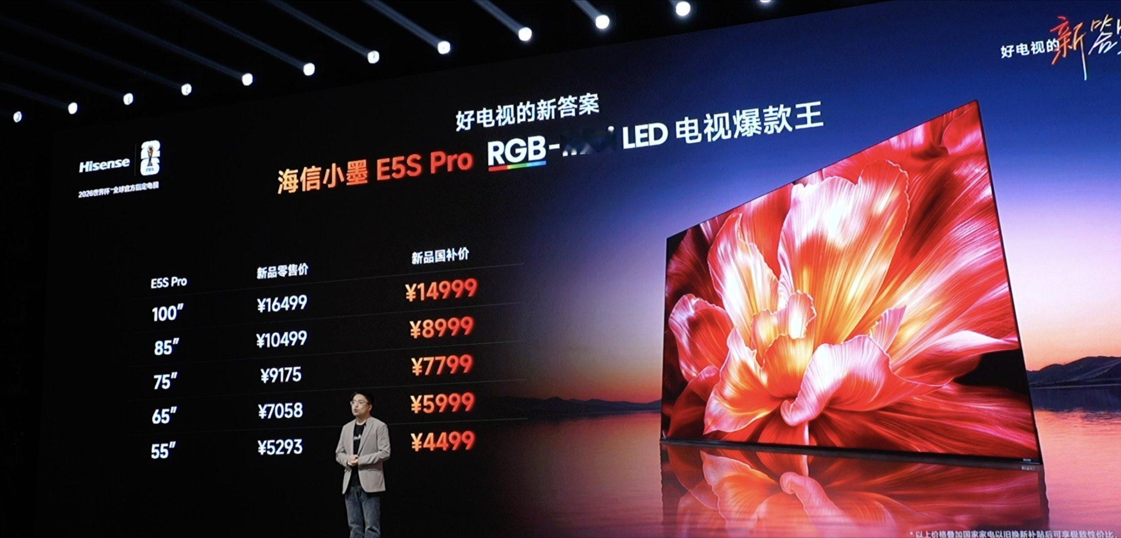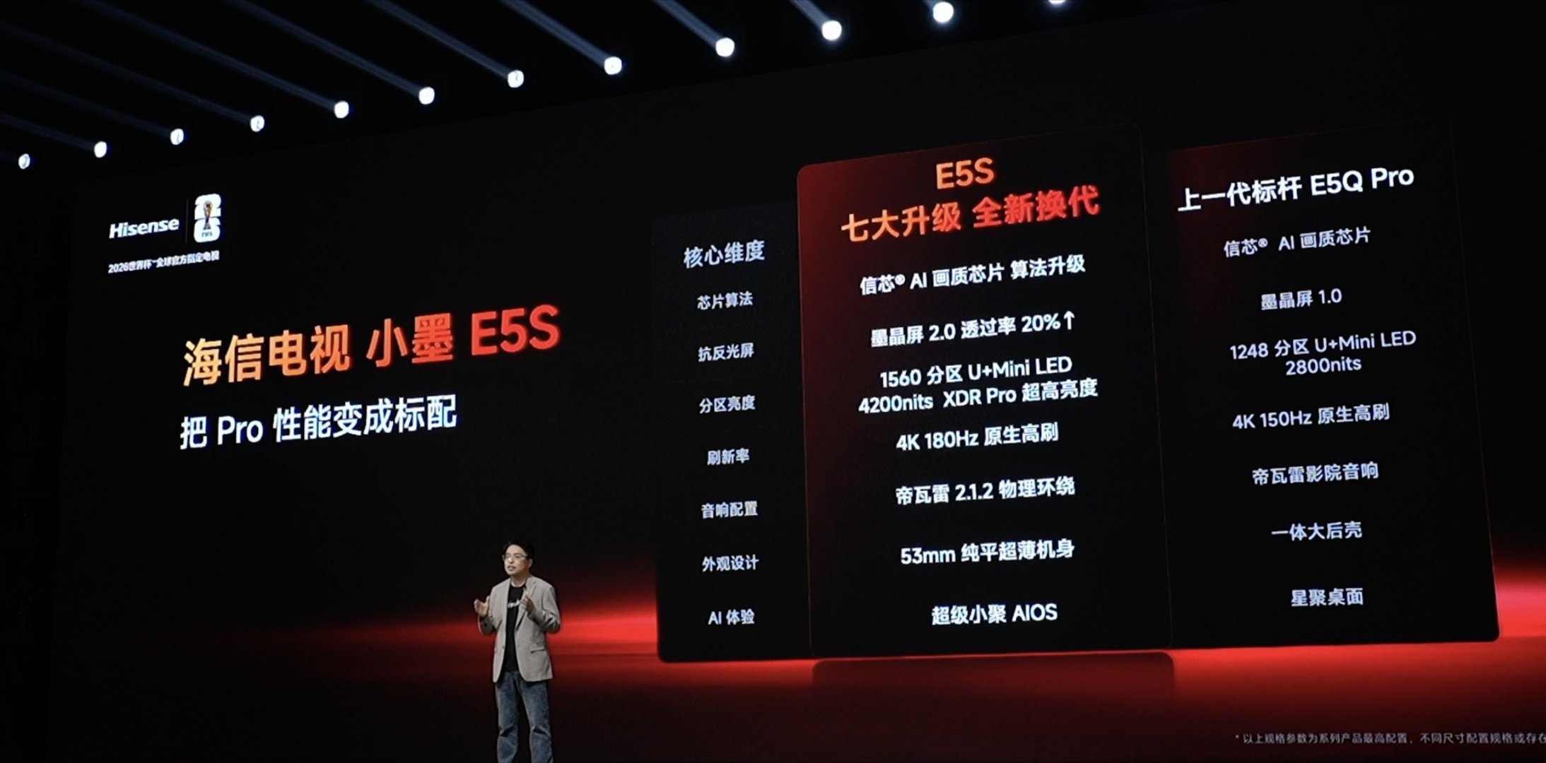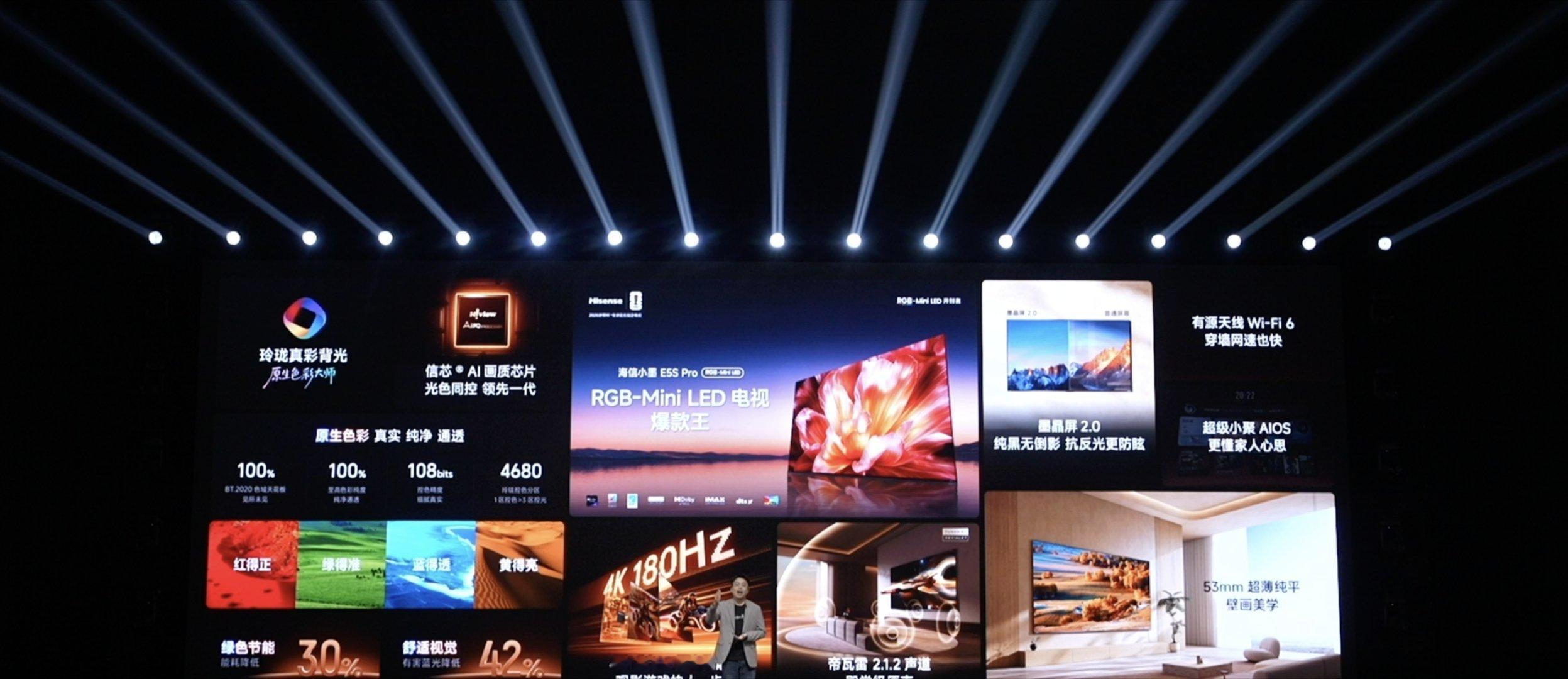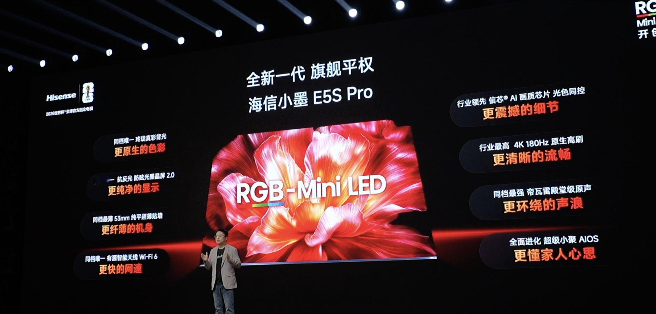 海信小墨 E5S Pro 定位 RGB-Mini LED 电视爆款王55 英寸国补 4499 元65 英寸国补 5999 元75 英寸国补 7799 元85 英寸国补 8999 元100 英寸国补 14999 元搭载信芯 AI 画质芯片,原生 4K 180Hz 高刷,四核 Cortex-A73 处理器,4+64GB 存储,墨晶屏 2.0,RGB-MiniLED,支持 100% BT.2020 色域,至高 4680 玲珑控色分区,3000nits XDR Pro 亮度,帝瓦雷 2.1.2 物理环绕音响,支持 Wi-Fi 6;