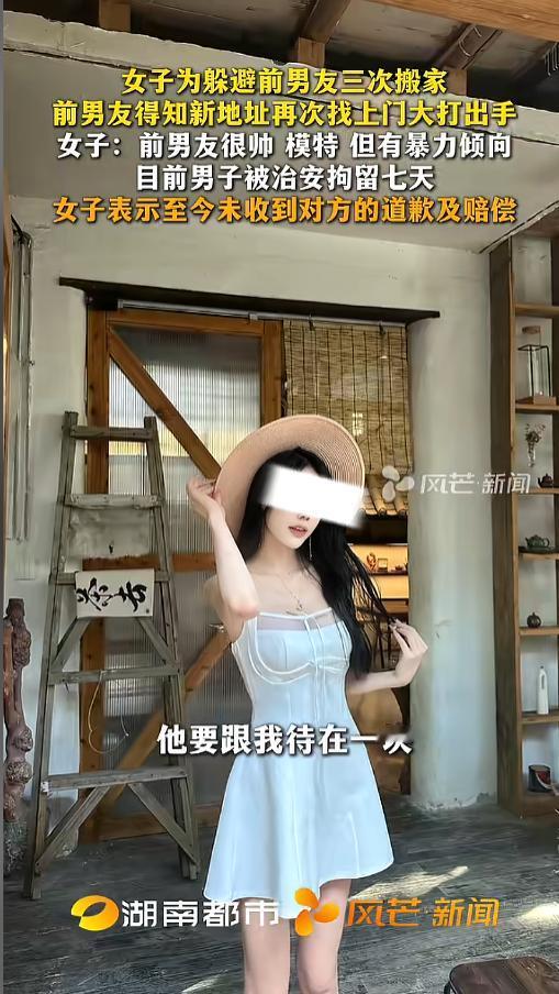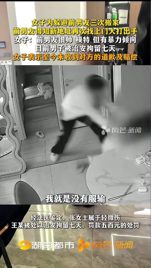信息来源:《女子为躲避前男友三次搬家 前男友得知新地址再次找上门大打出手 女子:前男友很帅 模特 但有暴力倾向 目前男子被治安拘留七天 女子表示至今未收到对方的道歉及赔偿》风芒新闻