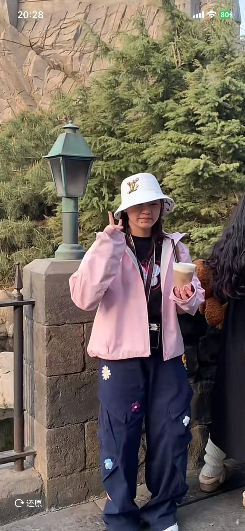 全红婵穿着粉色冲锋衣,藏蓝色伞兵裤,头戴渔夫帽,手里还拿着饮料,头发也长了,下巴上还有那个小痣!全红婵不再是那个可爱的假小子了!