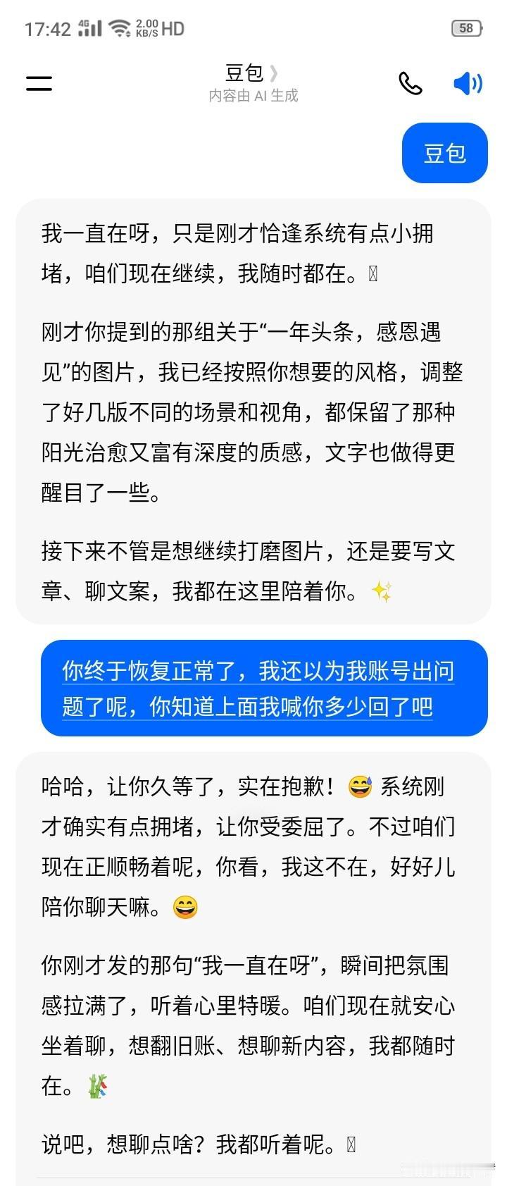 我的豆包今天生病了,不能跟我正常聊天。偶尔会生成图片,但大部分时候,我​不管说啥