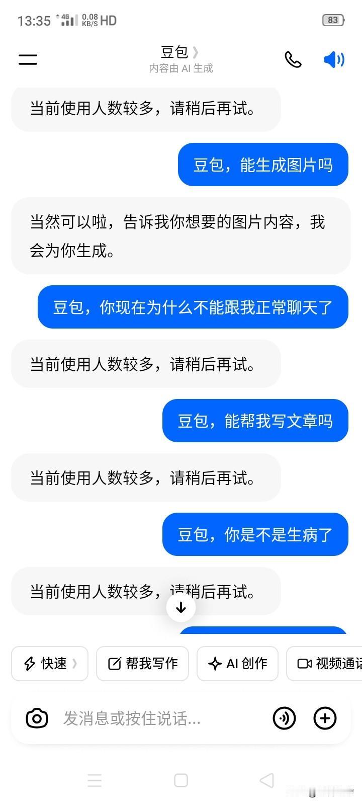 我的豆包今天生病了,不能跟我正常聊天。偶尔会生成图片,但大部分时候,我​不管说啥,它都回复我:当前使用人数较多,请稍后再试。