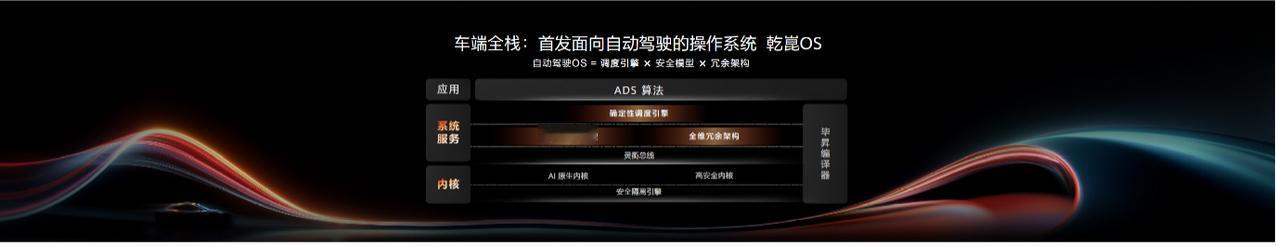 1、行业首个面向自动驾驶的乾崑OS操作系统 ,确定性调度引擎借助灵衢总线等技术,可以降低车内信号30%时延,确保紧急Cut-In等低时延任务能及时执行。全链路安全模型和全维冗余架构,可确保数据的安全与系统的稳定。