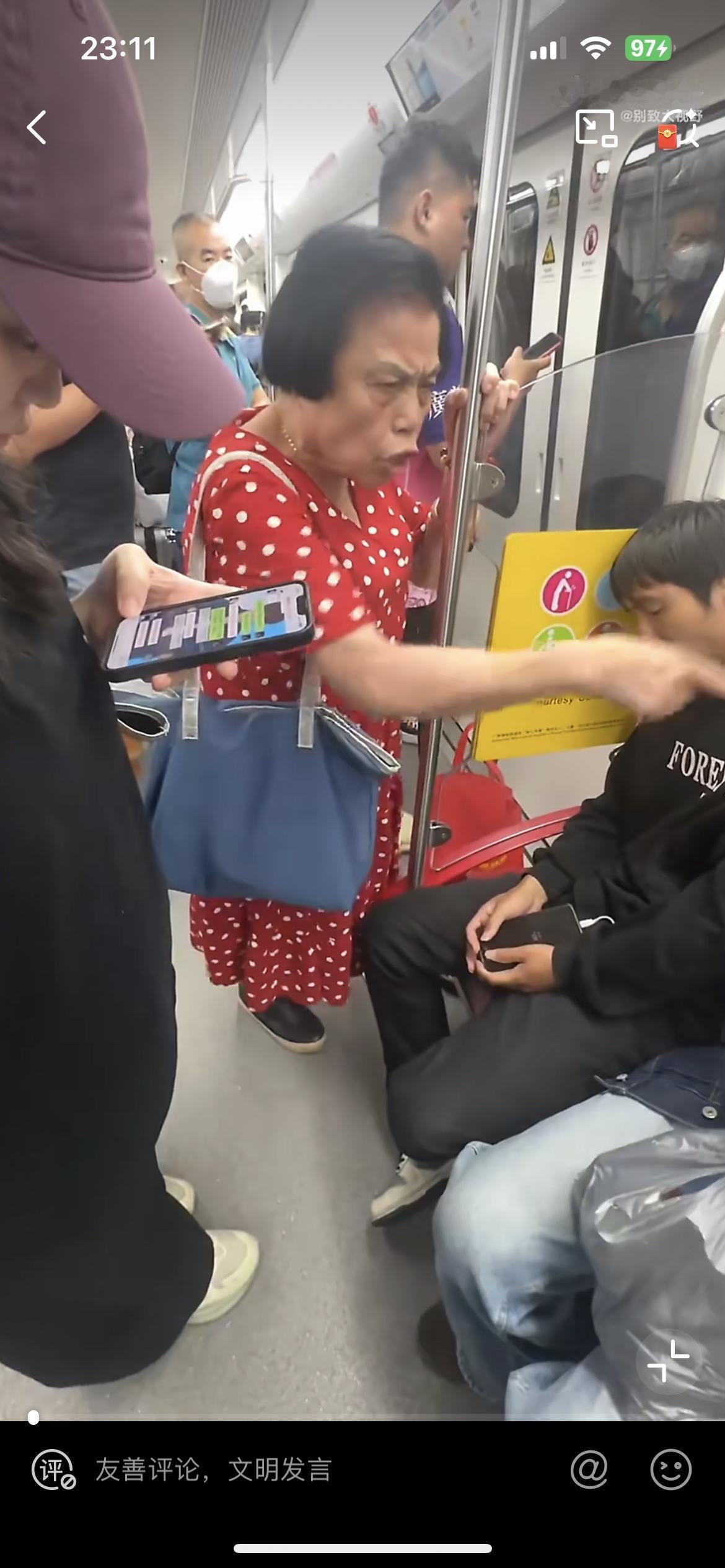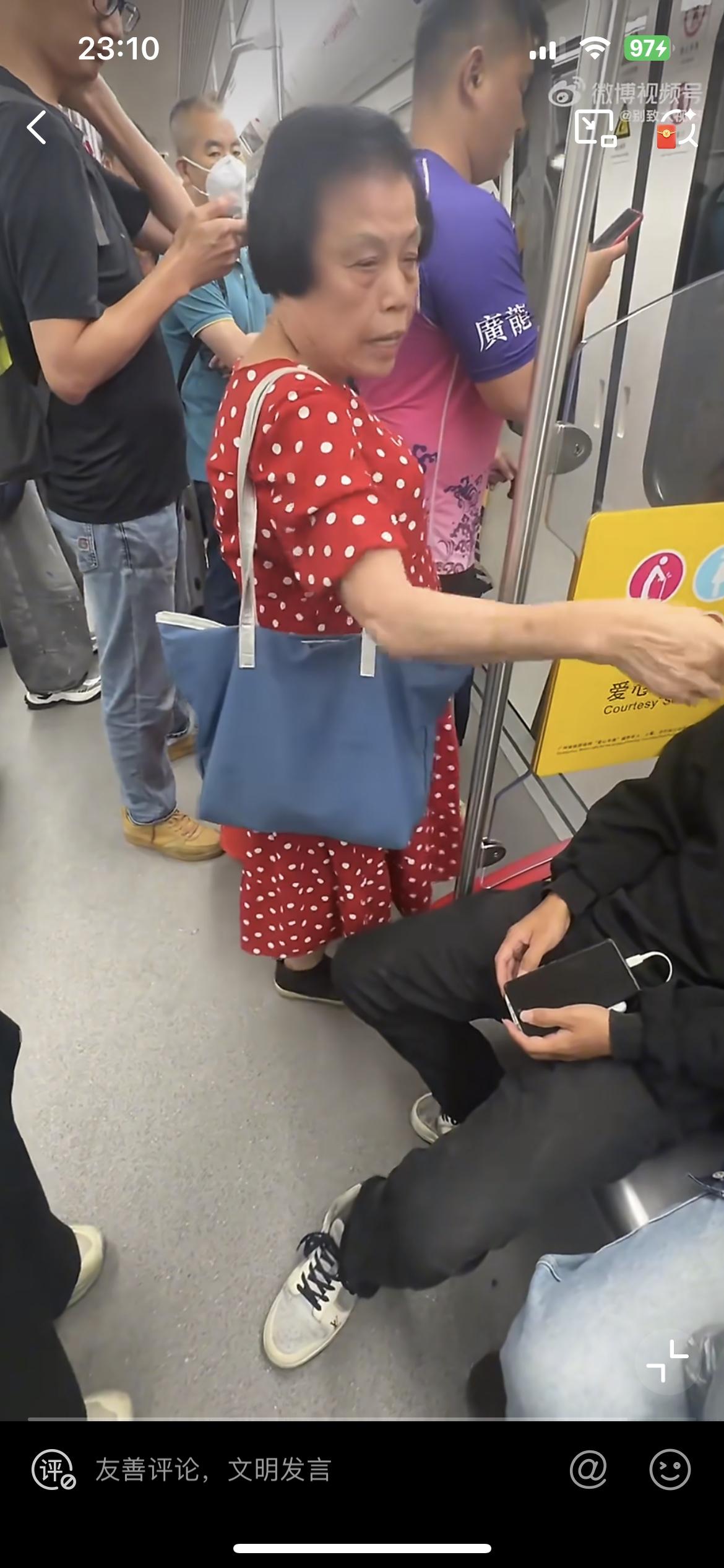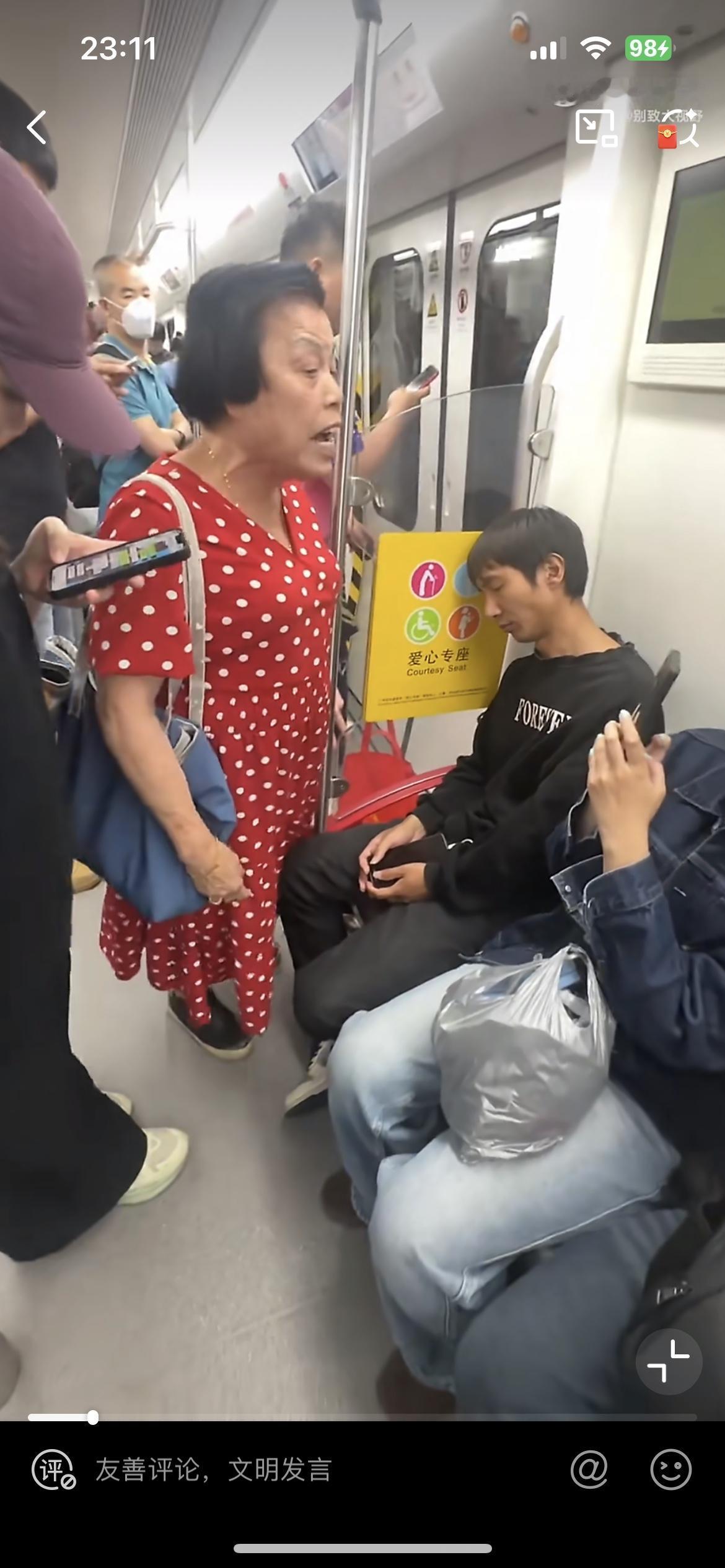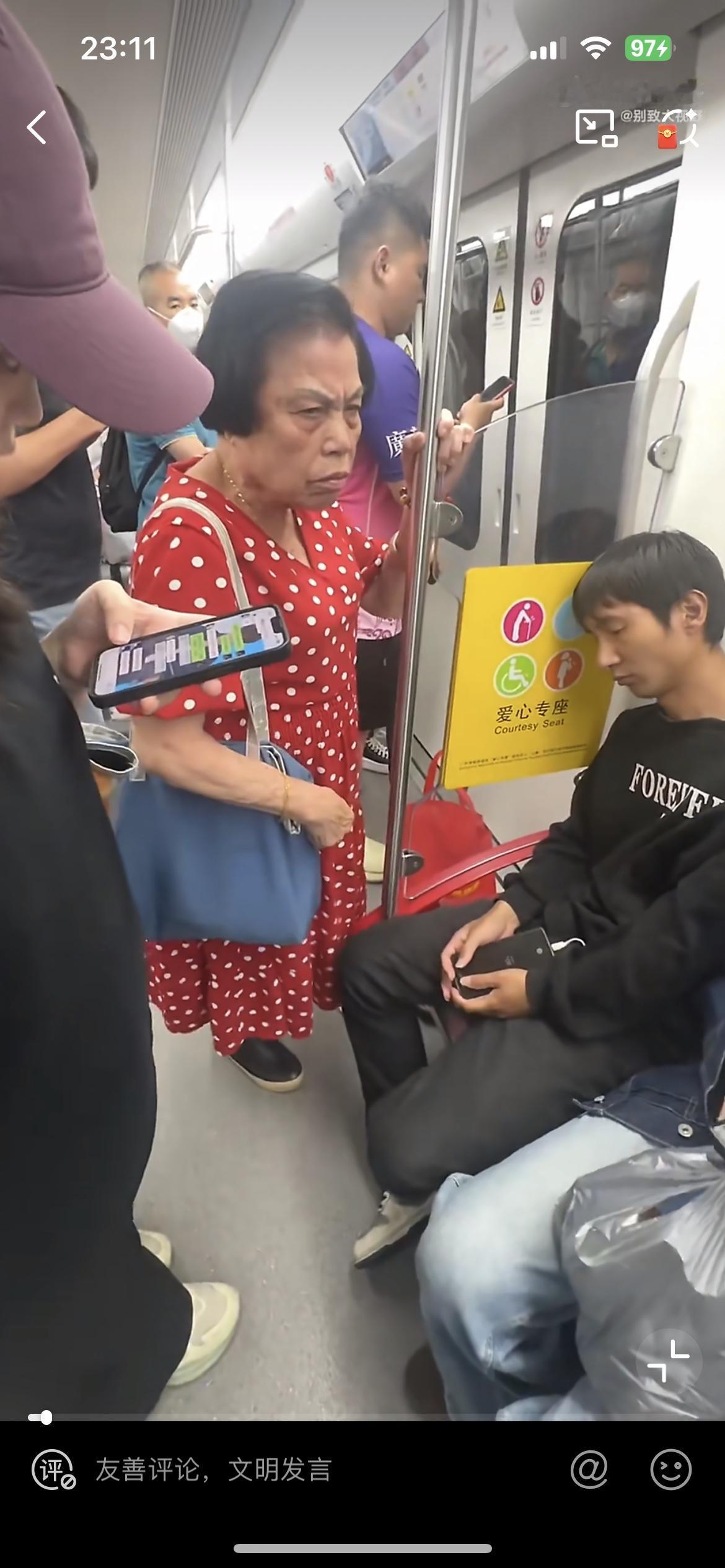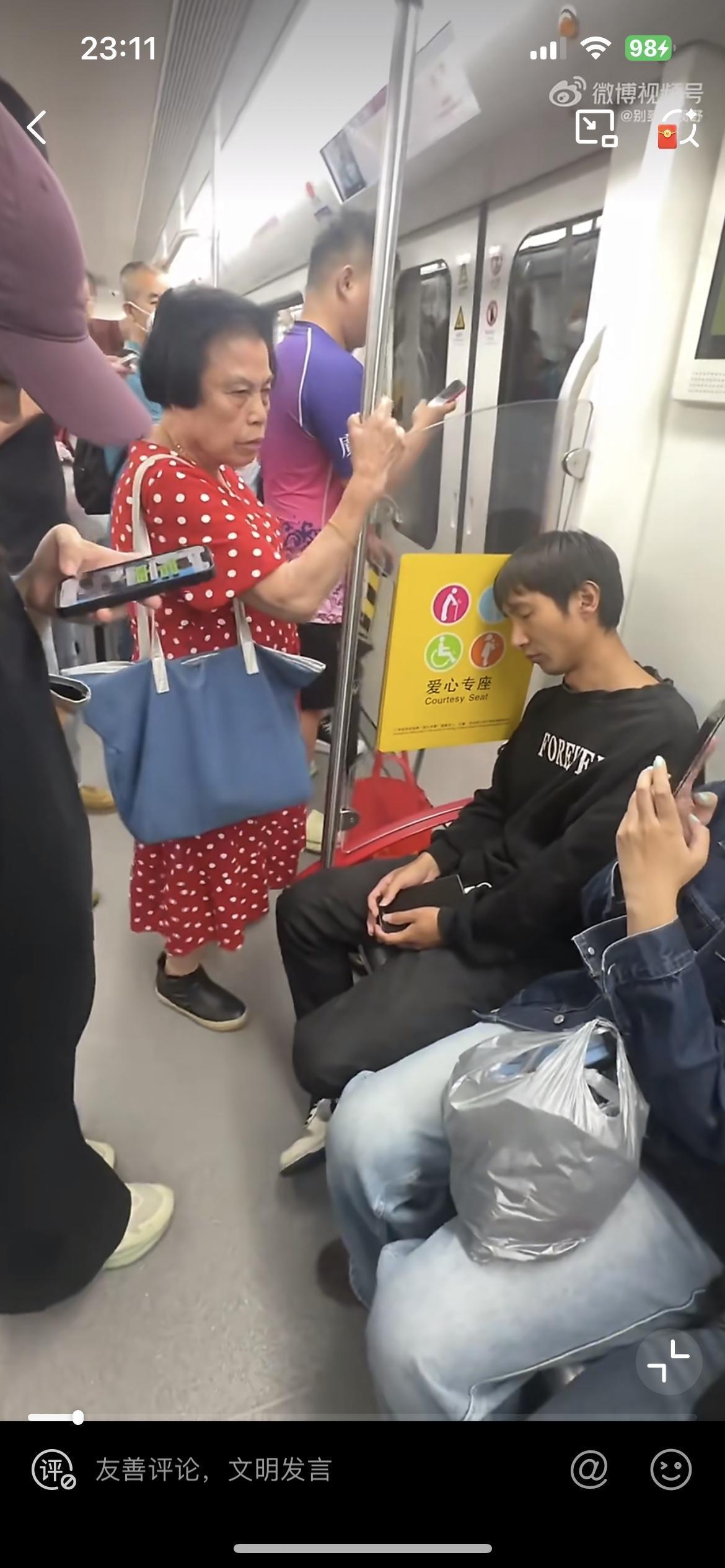 广州大妈地铁上要求一女生给她让座,女生拒绝了,大妈骂了一路。就这个怼人的架势,大妈的身体不需要让座吧?看了下这个扶手上面写了爱心专座,显然旁边穿黑衣服的小伙子占了爱心专座,他一直在那里闭目养神。老太可能看他是年轻小伙,欺软怕硬,不敢指责他,专挑旁边的女生对付,有点拿捏软柿子的味道。女生拒绝了她的请求,老太觉得很没面子,就一直在指责她,说她不懂尊老爱幼,没素质。