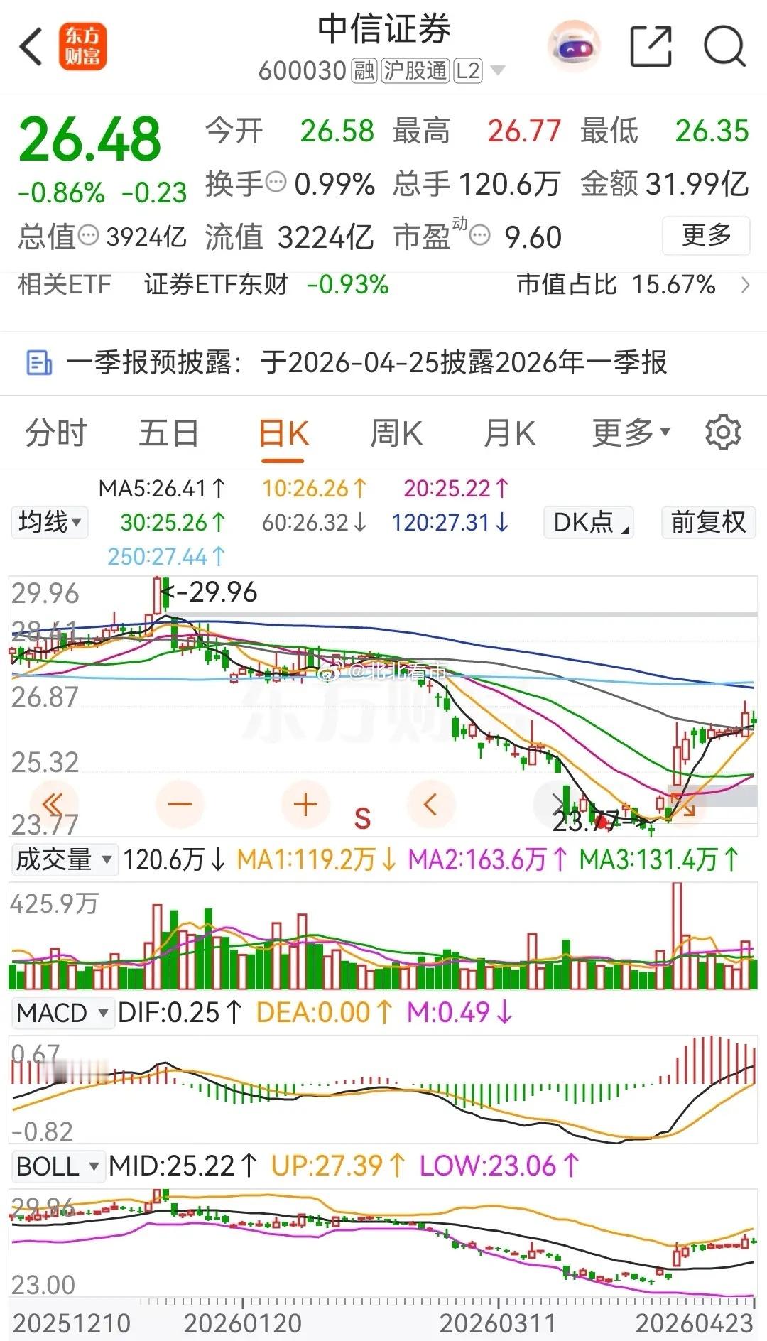 东方财富和中信证券缩量调整,分别下跌了1.44%和0.86%,券茅东方财富今天被主力资金净卖出了5.81亿元,券商一哥中信证券则是被主力资金净卖出了约3.0227亿元。截止今天收盘为止,东财在2026年的累计跌幅为13.82%,报价为19.89元;中信证券在2026年的累计跌幅为6.83%,报价26.48元。从当前的走势上看,中信证券今天虽然缩量调整,但是向上反弹的趋势未发生改变;而东财则是继续延续之前的横盘态势。