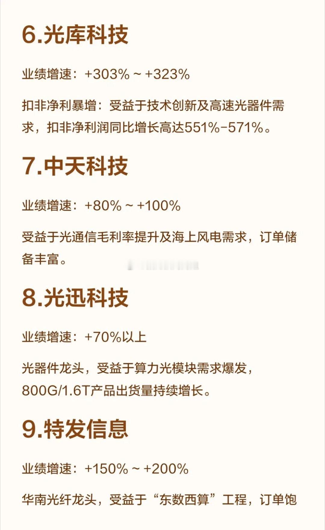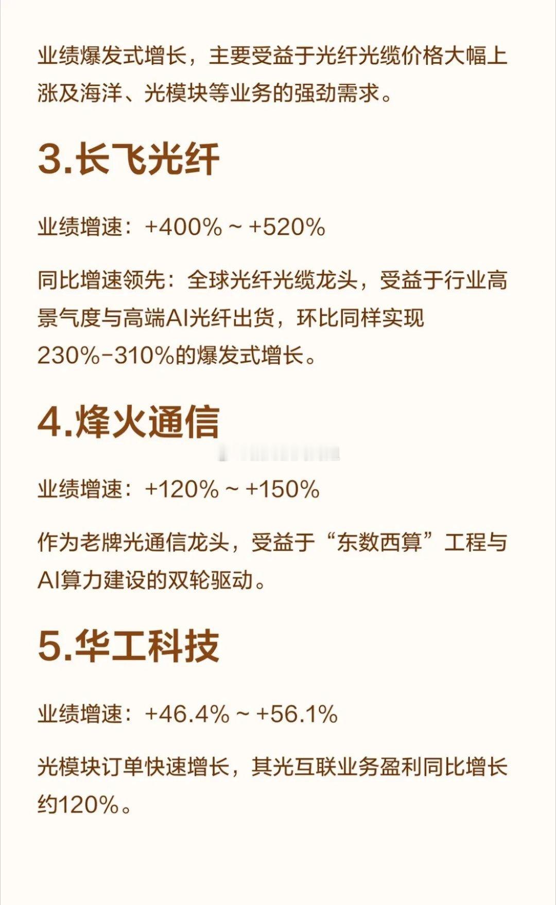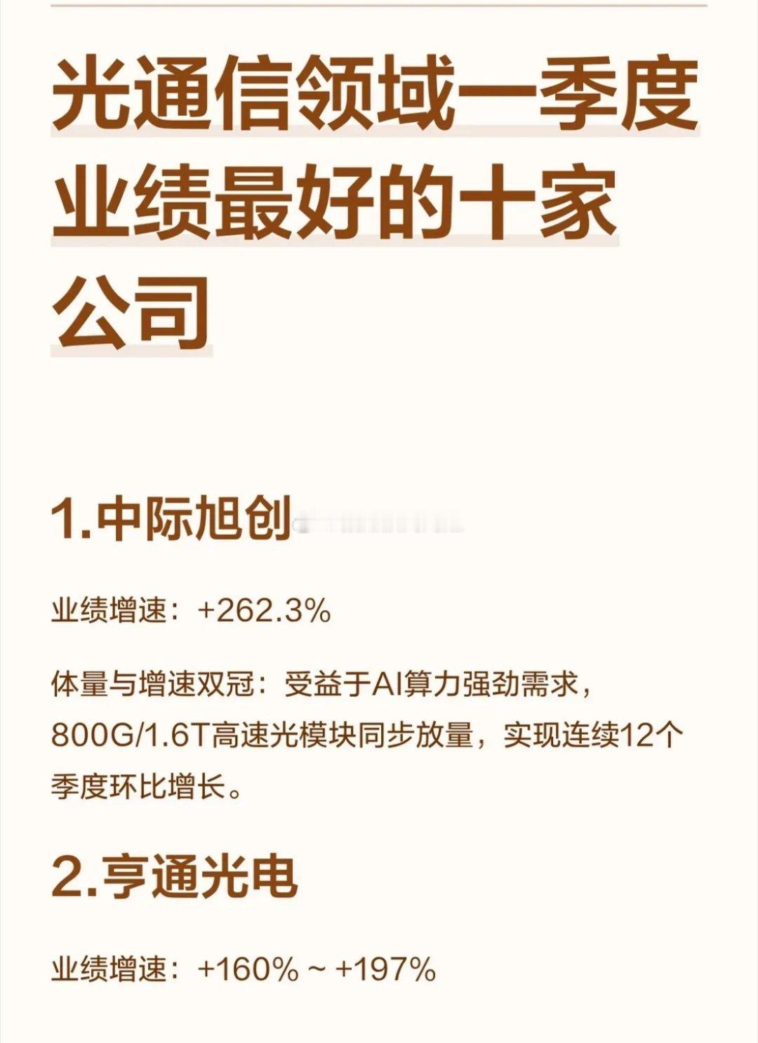 光通信领域一季度业绩最好的十家公司!中际旭创业绩增速:+262.3%体量与增速双冠:受益于AI算力强劲需求,800G/1.6T高速光模块同步放量,实现连续12个季度环比增长。亨通光电业绩增速:+160% ~ +197%业绩爆发式增长,主要受益于光纤光缆价格大幅上涨及海洋、光模块等业务的强劲需求。长飞光纤业绩增速:+400% ~ +520%同比增速领先:全球光纤光缆龙头,受益于行业高景气度与高端AI光纤出货,环比同样实现230%-310%的爆发式增长。烽火通信业绩增速:+120% ~ +150%作为老牌光通信龙头,受益于“东数西算”工程与AI算力建设的双轮驱动。华工科技业绩增速:+46.4% ~ +56.1%光模块订单快速增长,其光互联业务盈利同比增长约120%。光库科技业绩增速:+303% ~ +323%扣非净利暴增:受益于技术创新及高速光器件需求,扣非净利润同比增长高达551%-571%。中天科技业绩增速:+80% ~ +100%受益于光通信毛利率提升及海上风电需求,订单储备丰富。光迅科技业绩增速:+70%以上光器件龙头,受益于算力光模块需求爆发,800G/1.6T产品出货量持续增长。特发信息业绩增速:+150% ~ +200%华南光纤龙头,受益于“东数西算”工程,订单饱满。永鼎股份业绩增速:+225% ~ +388%光纤与光模块双轮驱动,受益于海外算力订单爆发。