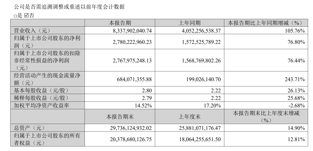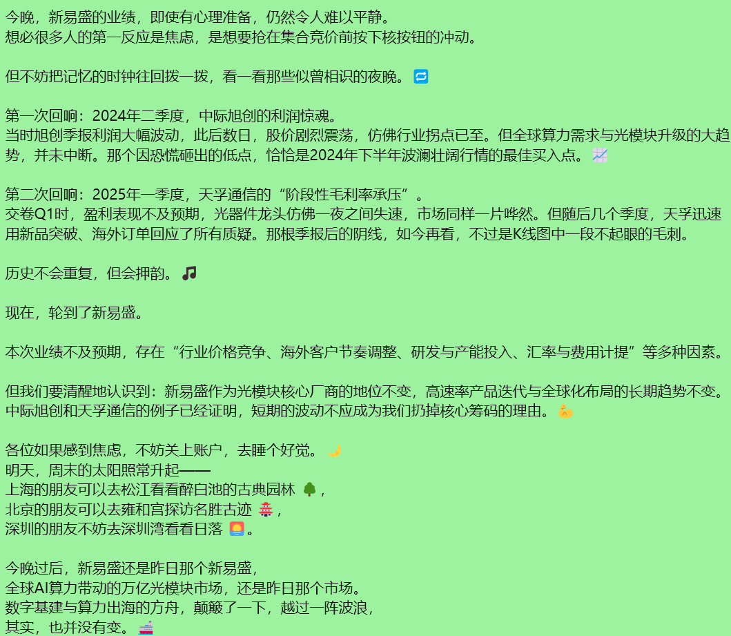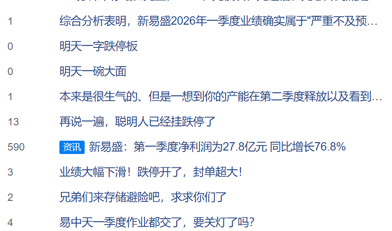 【大牛股新易盛发布一季报 市场“炸锅”了!业绩数据低于主流机构一致预期 有分析指出:营收符合预期 利润有争议】今晚新易盛的业绩似乎不及预期,市场“炸锅”了。就在光模块创新高之际,这份财报给一群“光”的信徒们浇了一盆冷水。4月23日晚间,大牛股新易盛发布一季度财报。数据显示,第一季度营业收入为83.38亿元,同比增长105.76%;归母净利润为27.80亿元,同比增长76.80%,环比下降13%。这个数据低于一季度市场主流机构一致预期,而公司本身的增长其实不算弱,但完全跑输了资金的超高预期。
