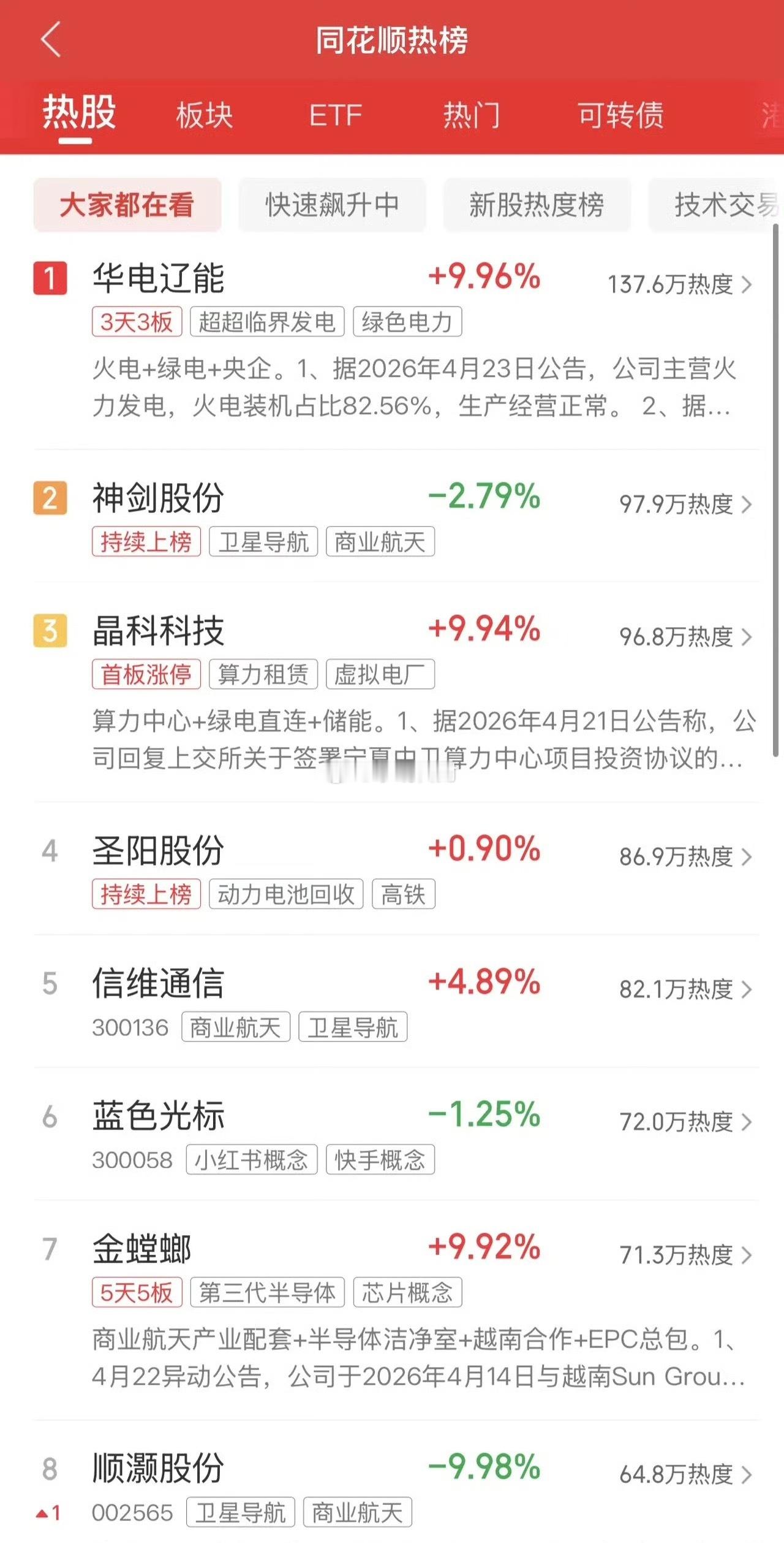 2026年4月23日,各大股吧前十热股: 淘股吧: 1.金螳螂 2.华电辽能 3.苏州高新 4.杭电股份 5.泰慕士 6.美诺华 7.安诺其 8.深科技 9.中新集团 10.圣阳股份东财吧: 1.华电辽能 2.金螳螂 3.三安光电 4.晶科科技 5.永鼎股份 6.云南锗业 7.亨通光电 8.节能风电 9.圣阳股份 10.工业富联同花顺: 1.华电辽能 2.神剑股份 3.晶科科技 4.圣阳股份 5.信维通信 6.蓝色光标 7.金螳螂 8.顺灏股份 9.博云新材 10.节能风电 趋势强者恒强,调整的时候逆市上涨,修复的时候往往能够强更强。节前看调整,节后如无意外继续创新高。A股股票今日看盘东方财富