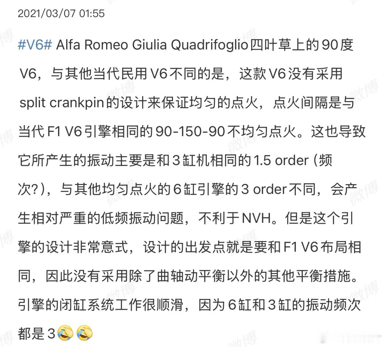 5 年前我写过阿尔法罗密欧 Giulia 的 90° V6 发动机,这台 V6 特立独行地采用了和当代 F1 一样的 90°-150° 不等间隔点火,造就了独特的个性。