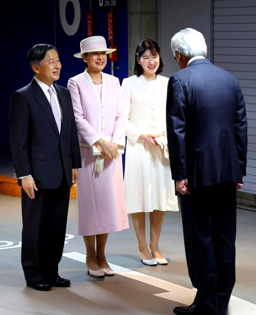 雅子从头到脚罩着一套纯粉色的正装,款式规规矩矩。站在一侧的爱子公主,则是从头到脚一身素白。