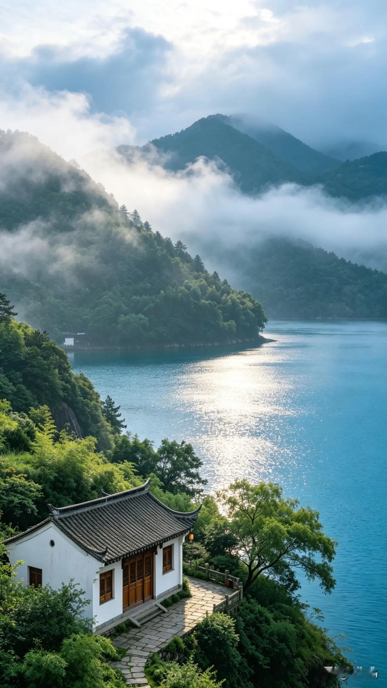 朝辉映水起云烟。