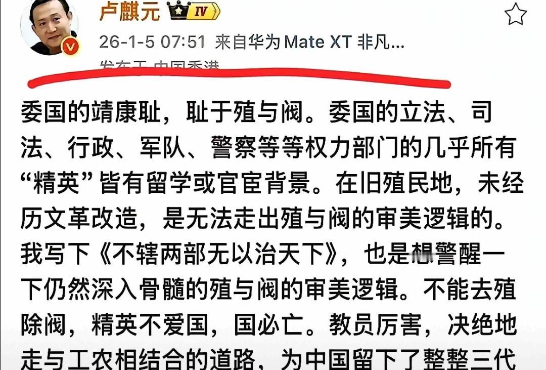 卢麒元又火了,网上吵得脸红脖子粗,谁也说服不了谁。他直播说“精英不爱国则国必亡”