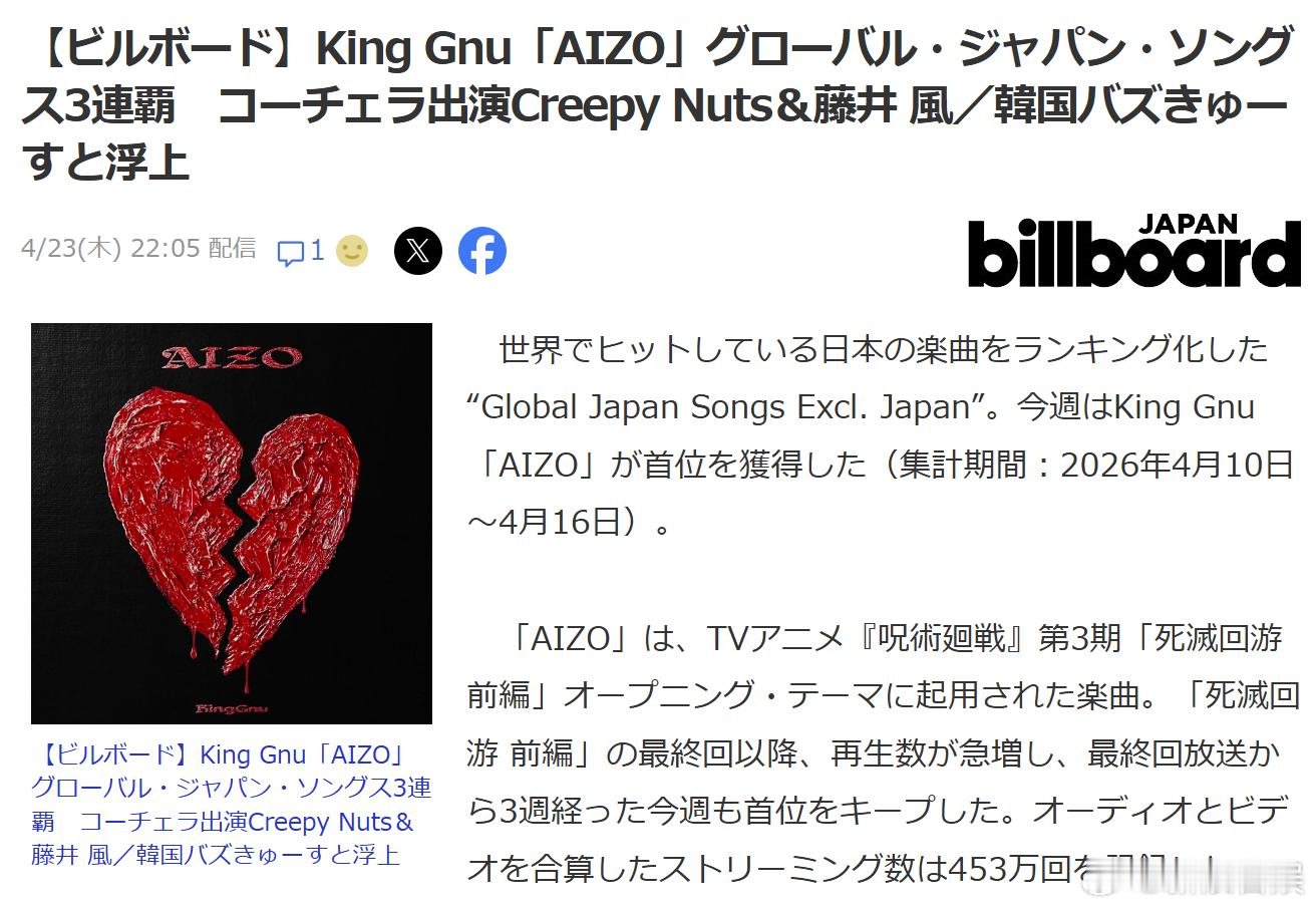 在“Global Japan Songs Excl. Japan”榜单中,KingGnu的《AIZO》以453万次的流媒体播放次数获得第一(数据统计期间:2026年4月10日~4月16日)。