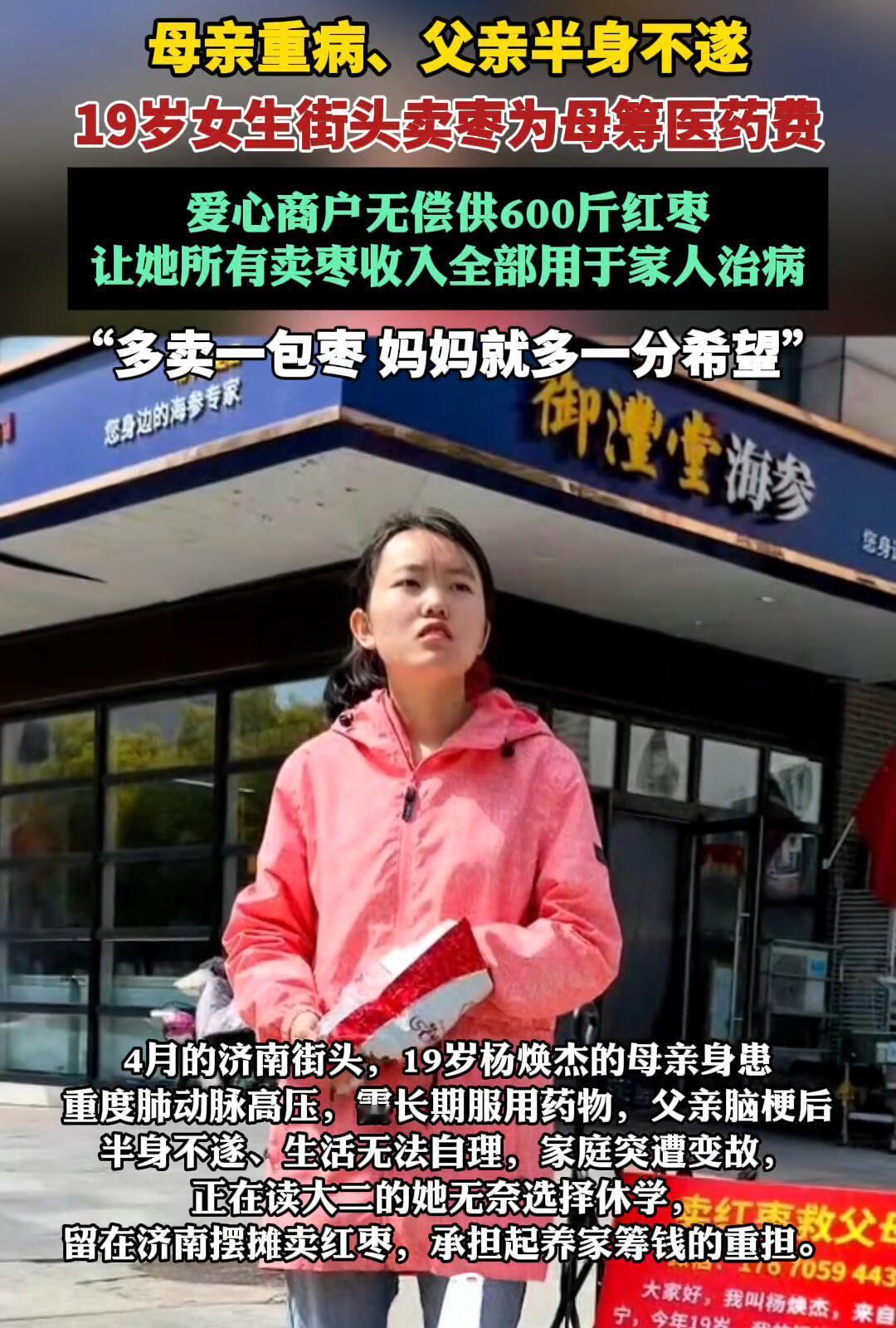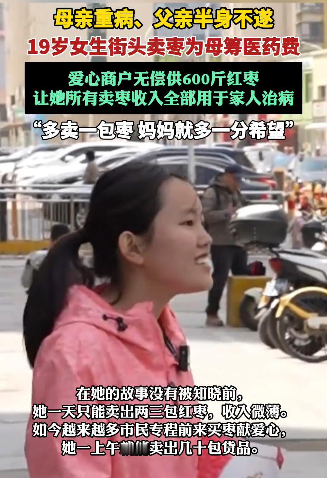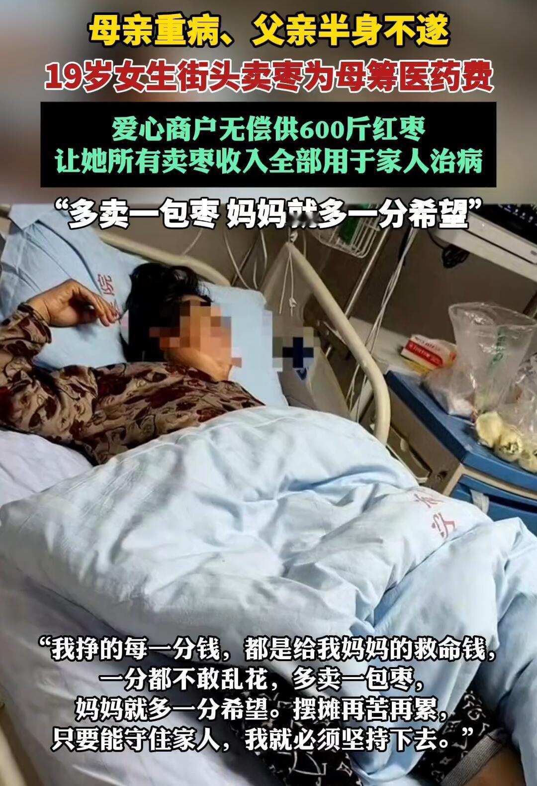 我们点赞这份孝心,更敬佩这股韧性。但冷静下来想想,一个19岁的女孩,靠街头摆摊卖枣来支付双亲的重病医疗费,这本身是不是也透着点无奈?我们的社会救助体系、大病医保的托底功能,在这个时候,能不能更快一点、更有力一点地接住这个下坠的家庭?爱心涌来是温暖的奇迹,但一个社会的文明,不能总指望奇迹。