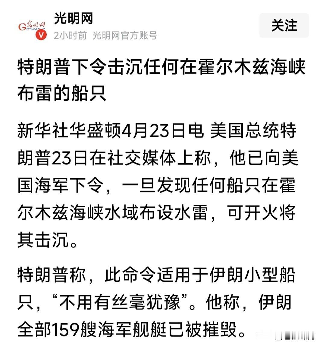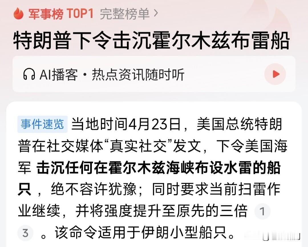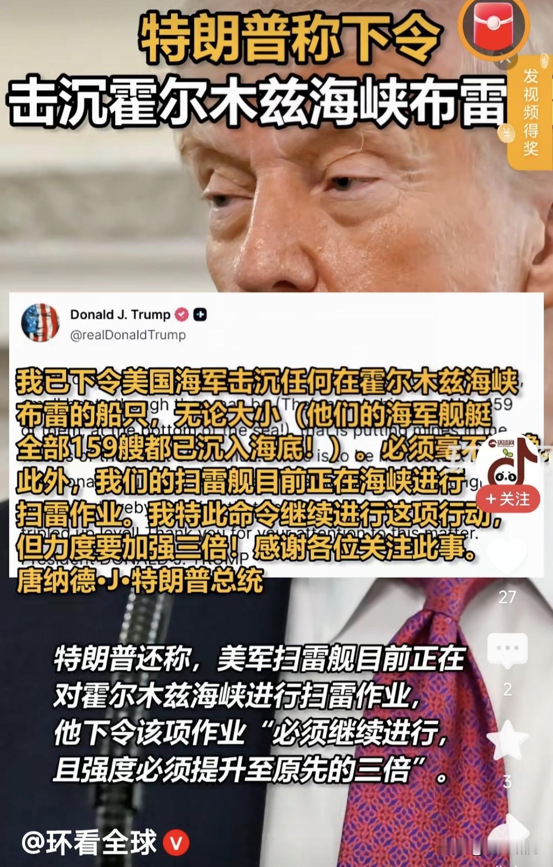 特朗普令美军加紧扫雷,击沉伊朗所有霍兹海峡布雷船只!声称摧毁伊海军舰艇159艘,美军要掌控霍兹海峡。