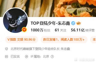 朱志鑫粉丝破1000万全新里程碑解锁!朱志鑫微博粉丝最先突破千万一路沉淀成长,在舞台之上打磨实力,在时光里慢慢蜕变,用专注和努力收获大众关注与喜爱。千万关注,是认可也是全新的开始,期待少年步履不停,奔赴更广阔的前路朱志鑫
