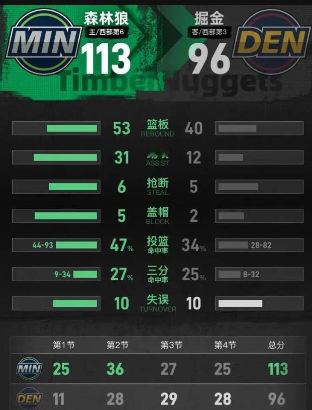 三连MVP被揍到-21,搁谁也想不到。约基奇27分15篮板,数据像精装外卖——包装唬人,拆开凉透。森林狼113-96把掘金摁在地上摩擦,我看完全程就一个字:爽。