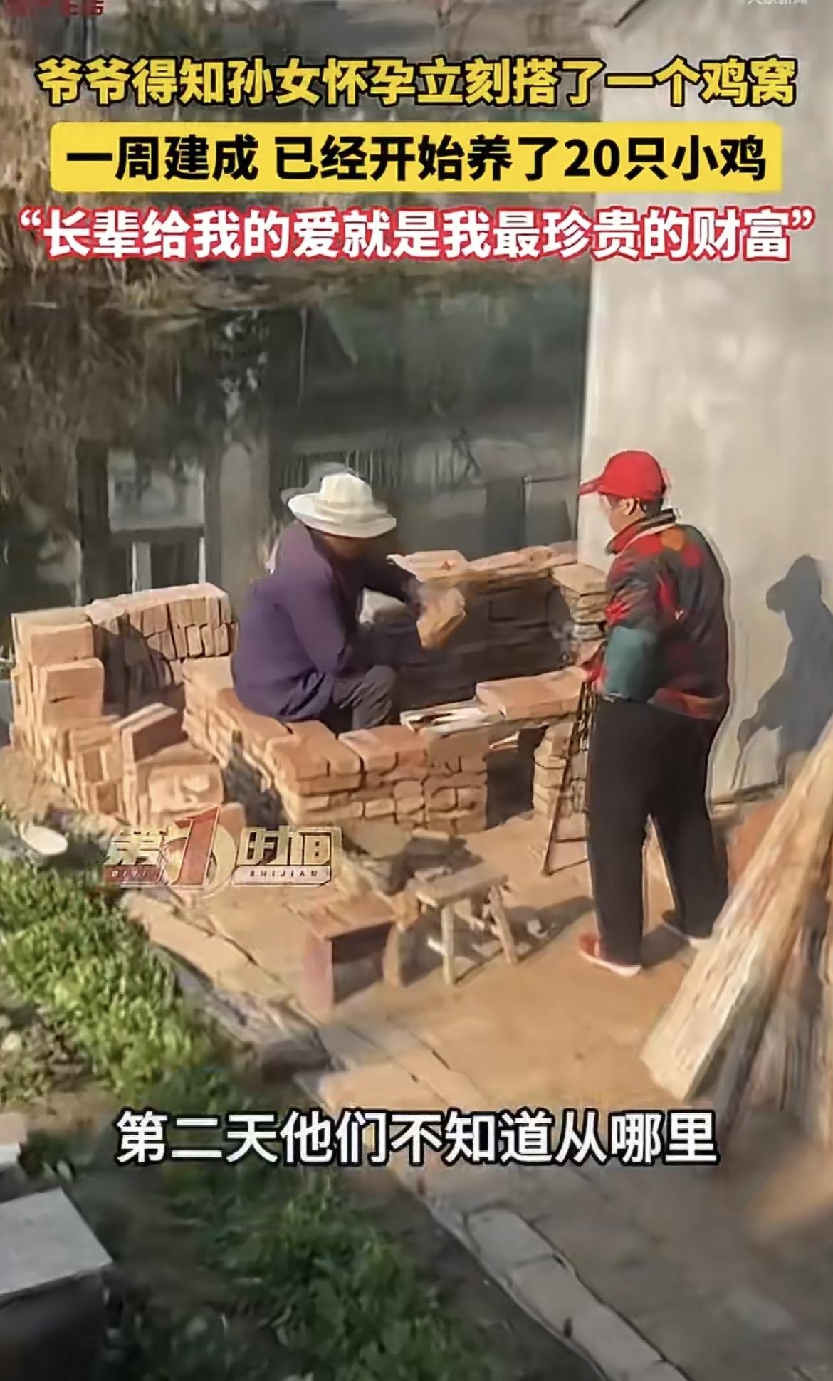幸福!孙女刚说怀孕,南通爷爷连夜拉来一堆红砖,转头花一周盖了个豪华鸡窝,还抓了20只小鸡养着。有人说现在超市啥鸡蛋买不着?其实这哪是盖鸡窝这是真的疼人,老一辈的爱就是这么实在。