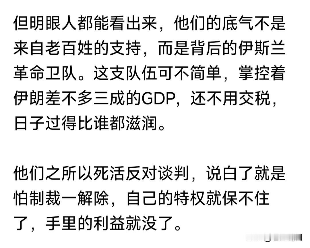 强硬派为何敢与老美死扛?因革命卫队控制伊朗1/3GDP,还不用缴税吃喝不愁。口喊“谈判就是服软,硬扛才有骨气”,实则是不想放弃利益?