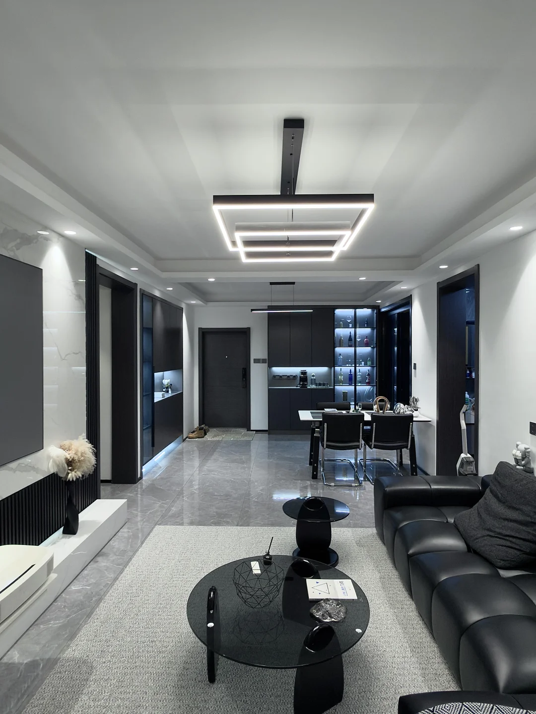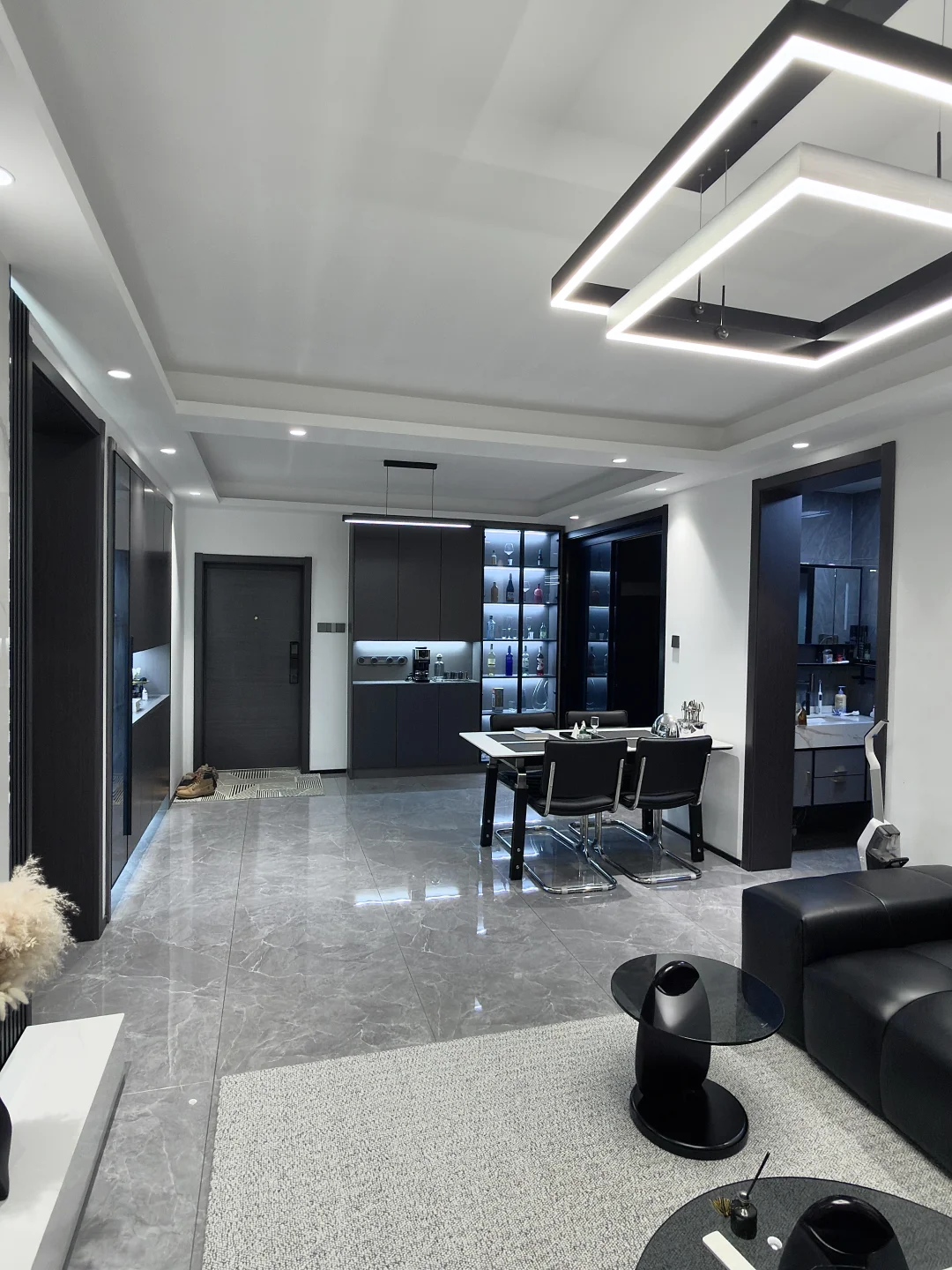 黑色的沙发搭配白色的地毯