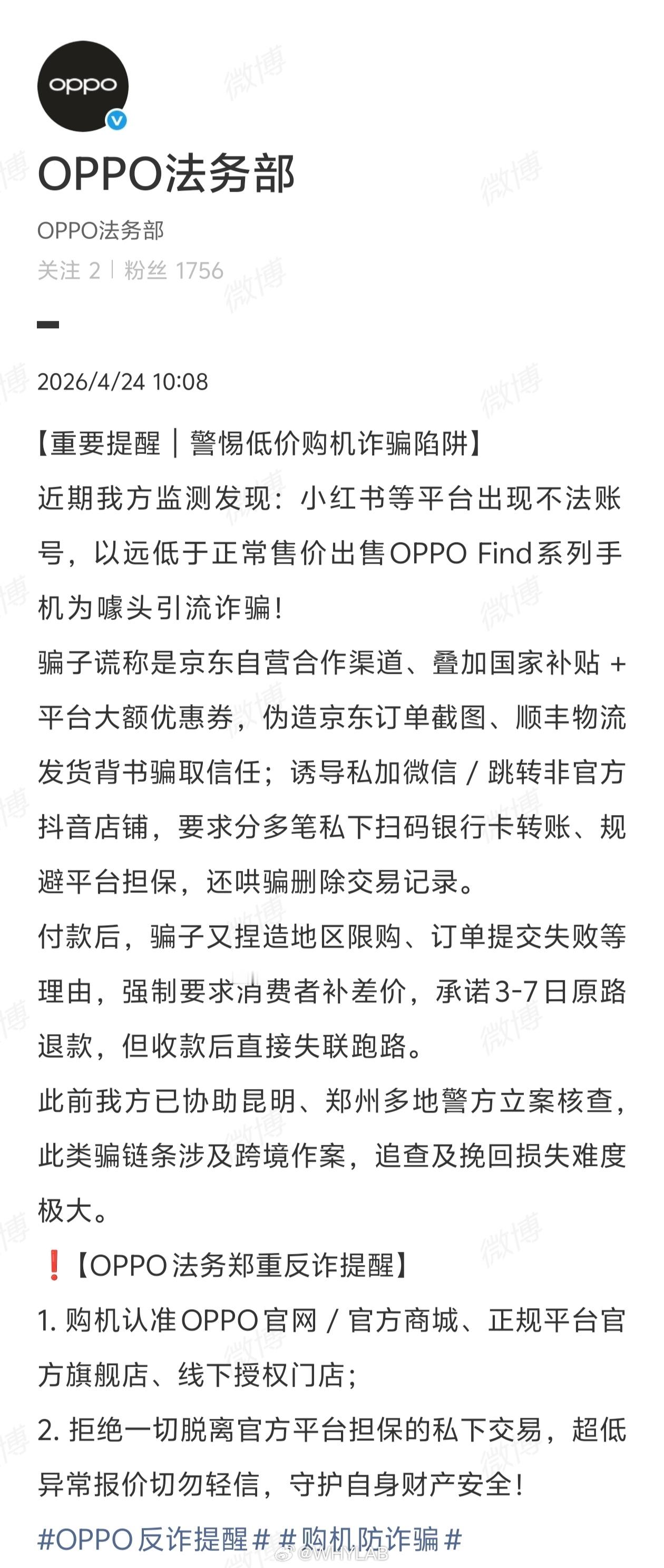 OPPO 法务部发布反诈提醒,目前已有不法账号在各大平台,以远低于市场价抛售 OPPO Find 系列手机为噱头引流行骗。