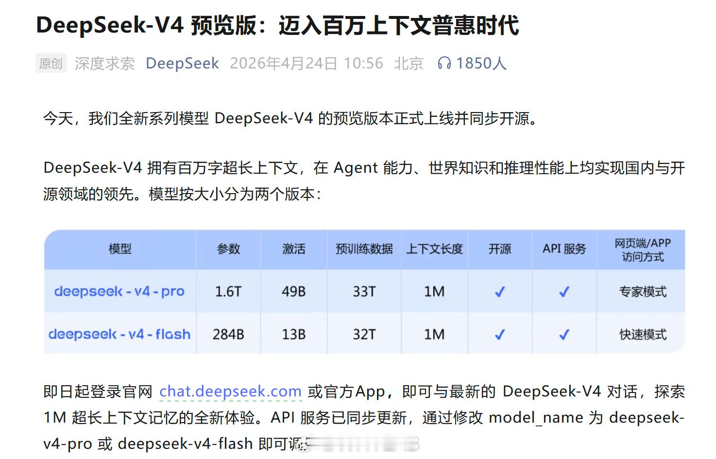 DeepSeekV4发布大的来了,DeepSeek-V4 的预览版本正式上线并同步开源,有两个版本,V4-Pro 与 V4-Flash,最大上下文长度为 1M,均同时支持非思考模式与思考模式。
