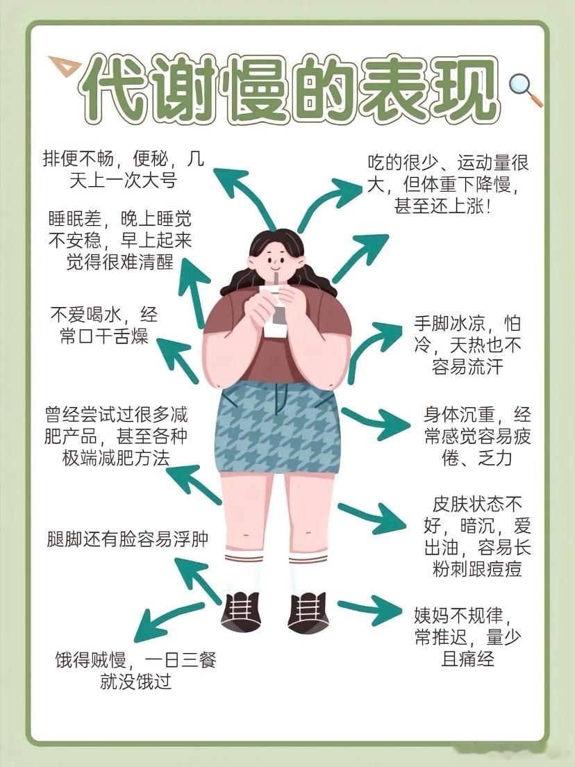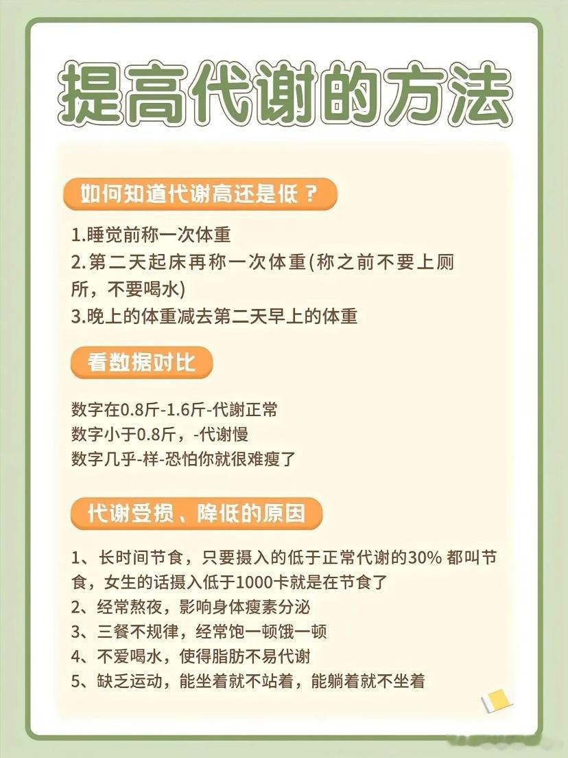 👉如何知道代谢高还是低?1.睡觉前称一次体重2.第二天起床再称一次体重(称之前不要上厕所,不要喝水)3.晚上的体重减去第二天早上的体重👉看数据对比:数字在0.8斤-1.6斤-代謝正常数字小于0.8斤,-代谢慢数字几乎-样-恐怕你就很难瘦了👉代谢受损、降低的原因:1、长时间节食,只要摄入的低于正常代谢的30%都叫节食,女生的话摄入低于1000卡就是在节食了2、经常熬夜,影响身体瘦素分泌3、三餐不规律,经常饱一顿饿一顿4、不爱喝水,使得脂肪不易代谢5. 缺乏运动,能坐着就不站着,能躺着就不坐着