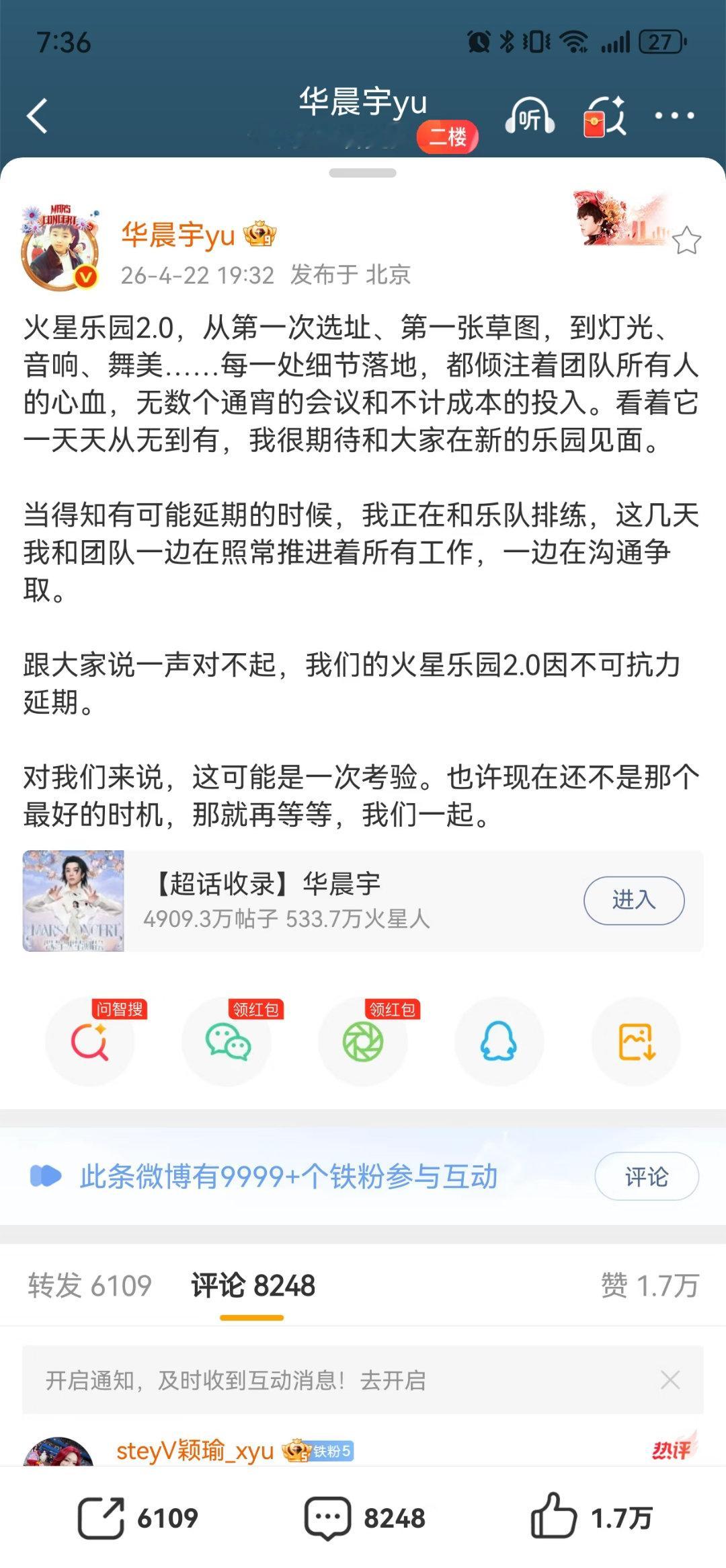 华晨宇演唱会官宣延期哭了。引进项目当地人反对,违约赔华晨宇一大笔钱,也不知道图啥