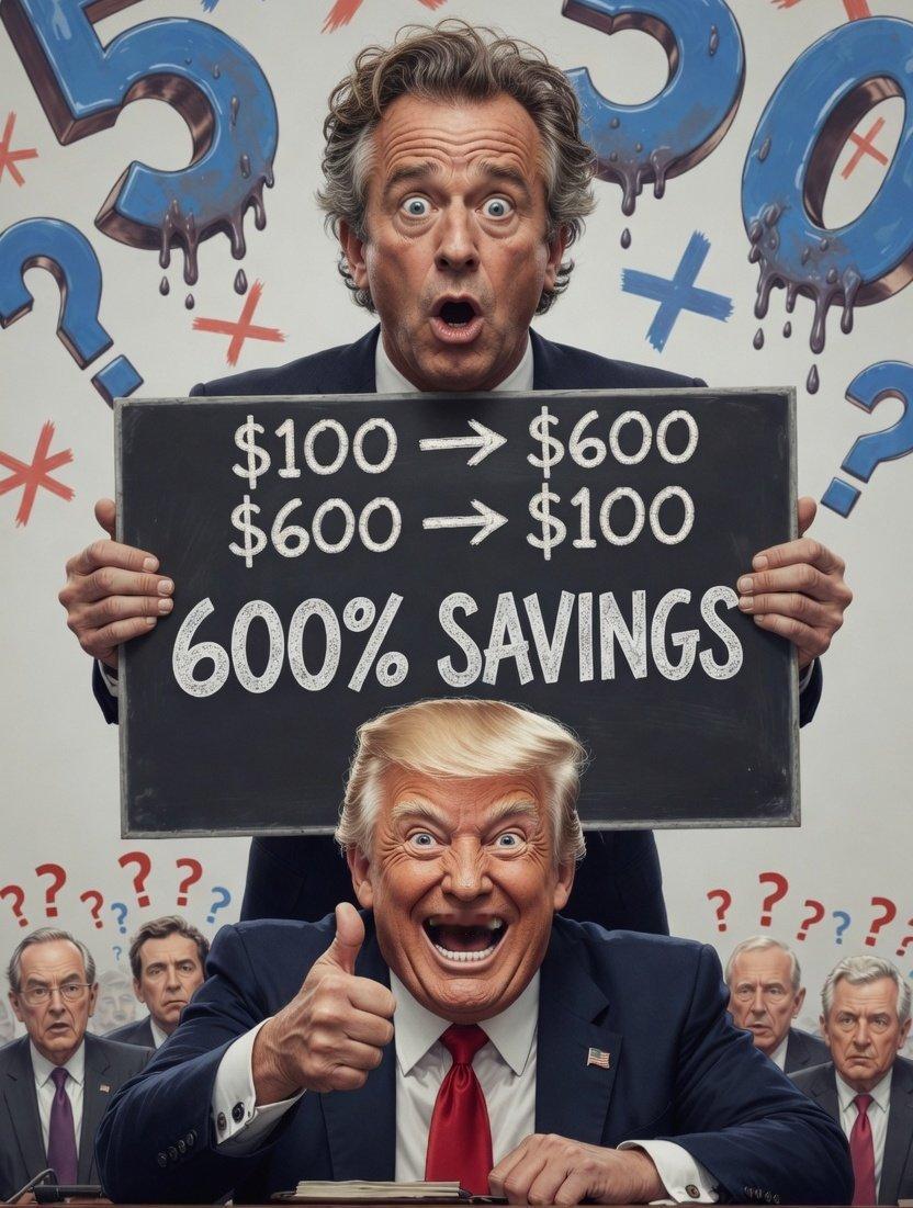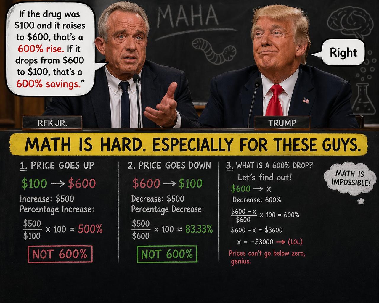 小罗伯特·肯尼迪:“一位民主党参议员声称,从数学角度来看,一种药的价格不可能下降600%。我说,‘如果这种药的价格是100美元,涨到600美元,那就是上涨了600%。如果它从600美元降到100美元,那就是节省了600%。”