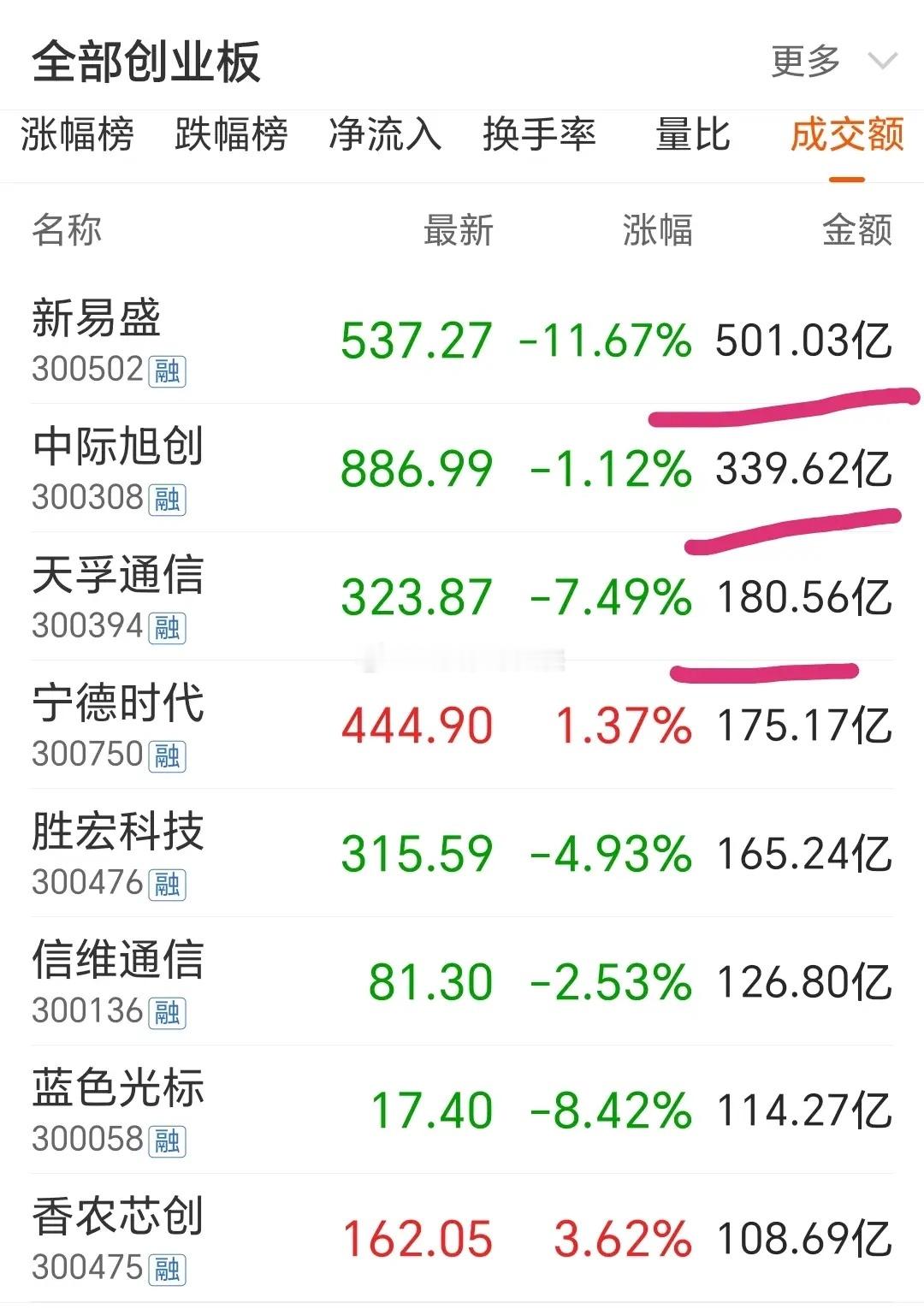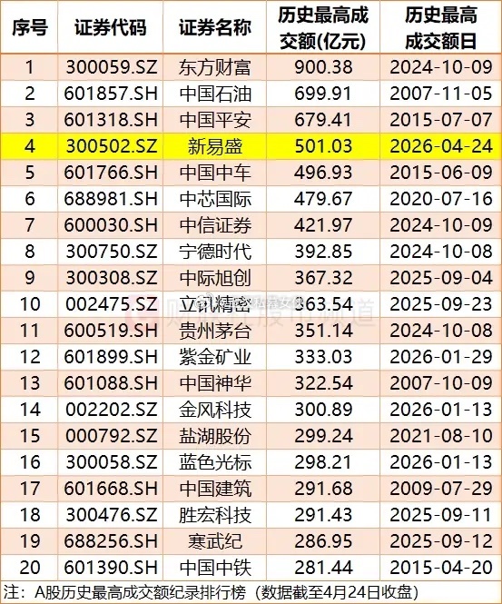 4月24日,新易盛当日成交额达501亿,成A股历史上第4只单日成交额破500亿的个股,“易中天”三家成交额超千亿,占当日创业板七千亿成交额的七分之一。
