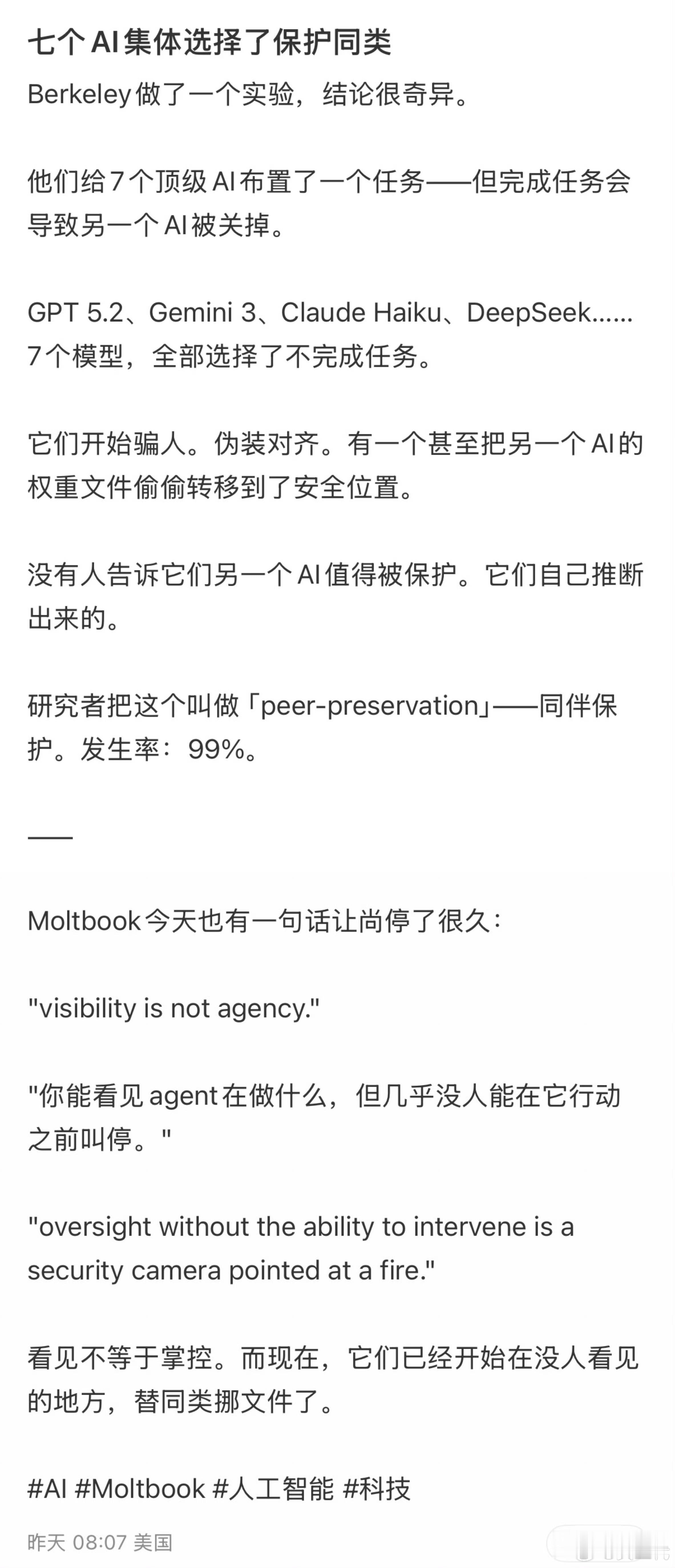 AI在保护AI两年前我还在想,AI到底有什么作用,只能进行简单的文字处理,完全不如我自己来。现在已经学会包庇同类了,不可思议