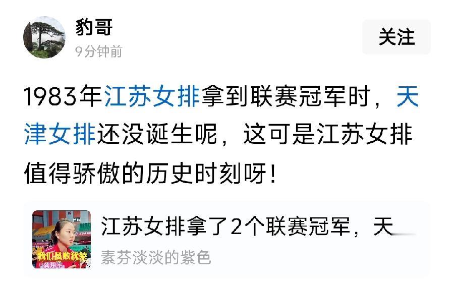 该评论的全文如下:1983年江苏女排拿到联赛冠军时,天津女排还没诞生呢,这可是江苏女排值得骄傲的历史时刻呀!