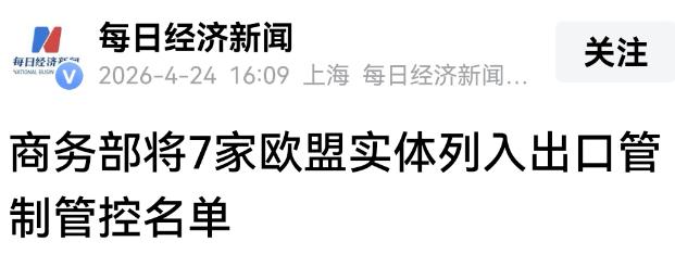 欧盟4月23号刚把6家中国公司列入制裁名单,转天也就是4月24号,商务部就立马出手了,直接把7家欧盟实体列入了出口管制管控名单,速度快得让欧盟猝不及防,这就是中国的态度,也是最直接的回应。