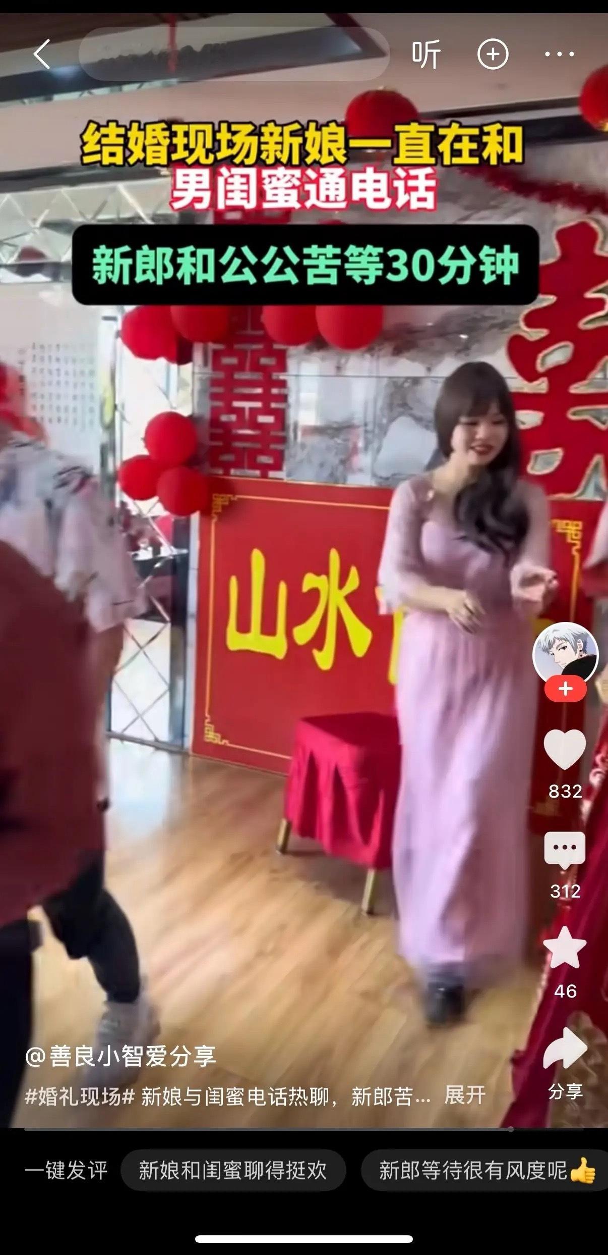 结婚现场,新娘一直和男闺蜜通电话。新郎和公公等了她近30分钟,她还在打电话。新郎最后一次叫她不要打了,马上要举行仪式了。新娘却说还要给前男友打个电话做最后的告别。新郎彻底怒了,拿上彩礼,转身就走,这个婚不结了。新娘急的直跺脚。女人活该,男子做的对。