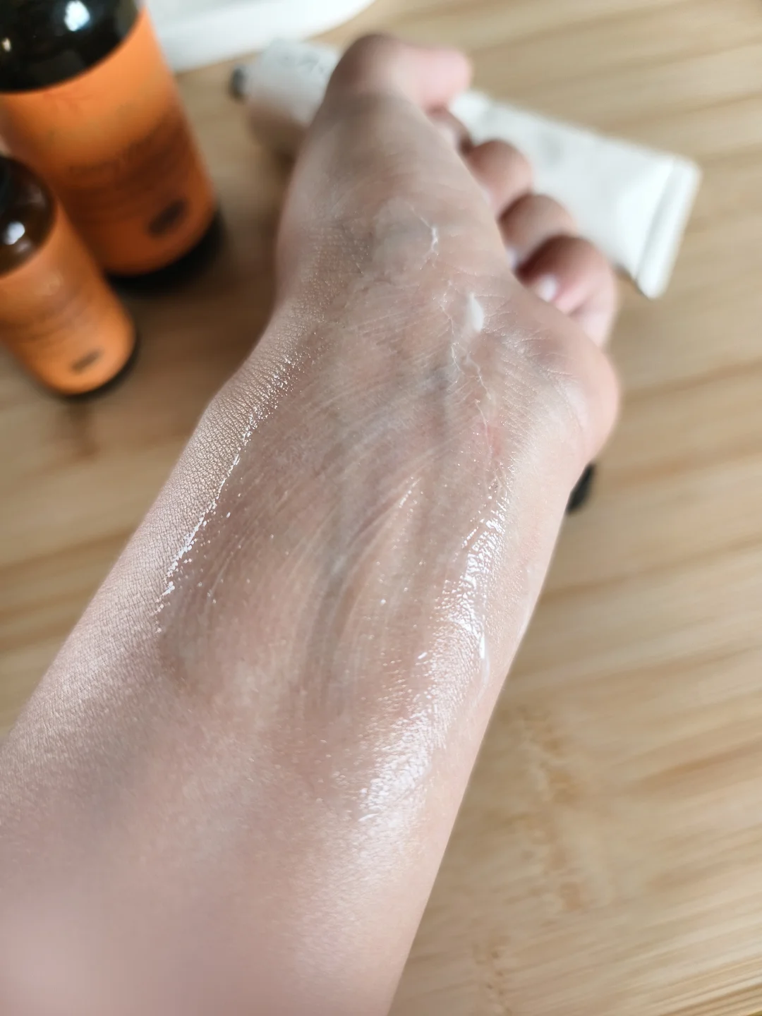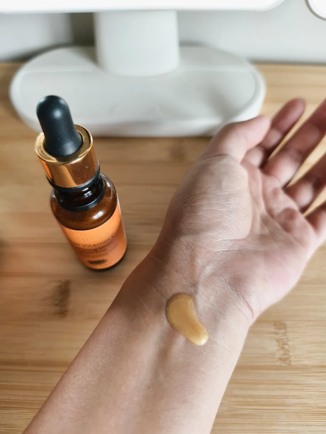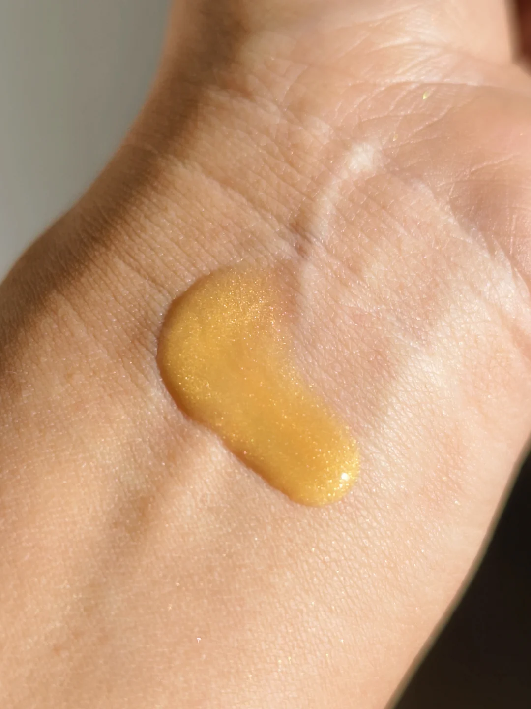 🍋它的原料是VC之王“卡卡杜李”,一种野生水果,VC含量超过橙子的100倍,核心就是针对夏天日晒的色素沉着。这个精华挤出来有金色细闪(看图3和图4),上脸有一股血橙的清香,很滋润,但是不油腻。