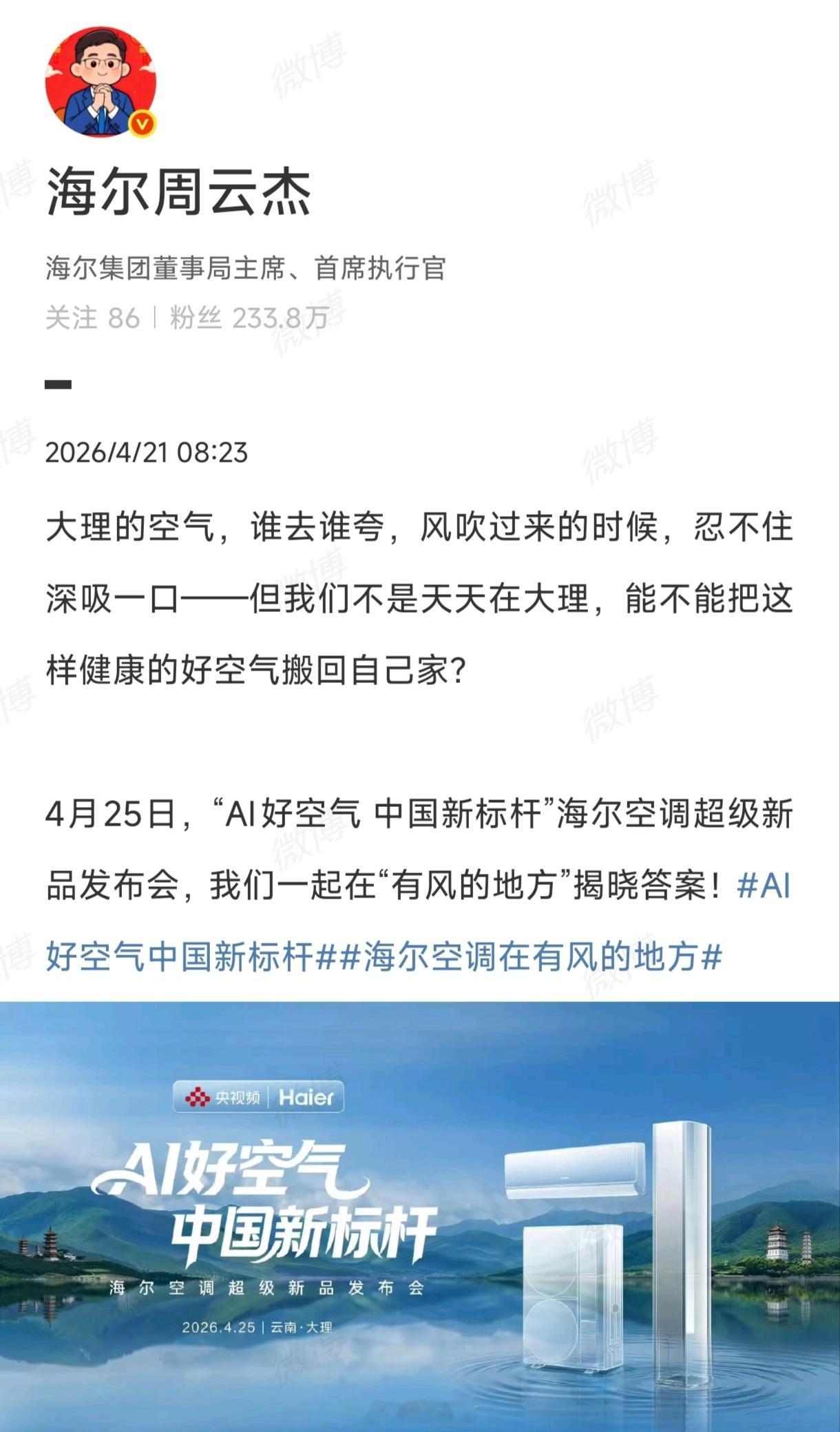 最近刷到海尔周总说要把大理那样的健康好空气带回家,真的越看越好奇,到底什么样的空调能真正做到这件事?揭晓周云杰说的好空气带回家的答案日常用空调的糟心事真的太多了,尤其是夏天,关窗开久了,屋里又干又闷,嗓子鼻子都发干。哪怕给滤网洗干净了,出风口还是会有股霉味,总觉得风里带着浮尘和细菌,要额外搭加湿器、空气净化器,成本加了不说,还给家里堆得乱糟糟。我猜这次的洗空气空调,就是冲着这些痛点来的。如果能把净化、除菌、调湿、控温全整合在一起,能直接把屋里的脏空气“洗”干净,那以后开着空调也能呼吸到像户外一样清新的空气了。
