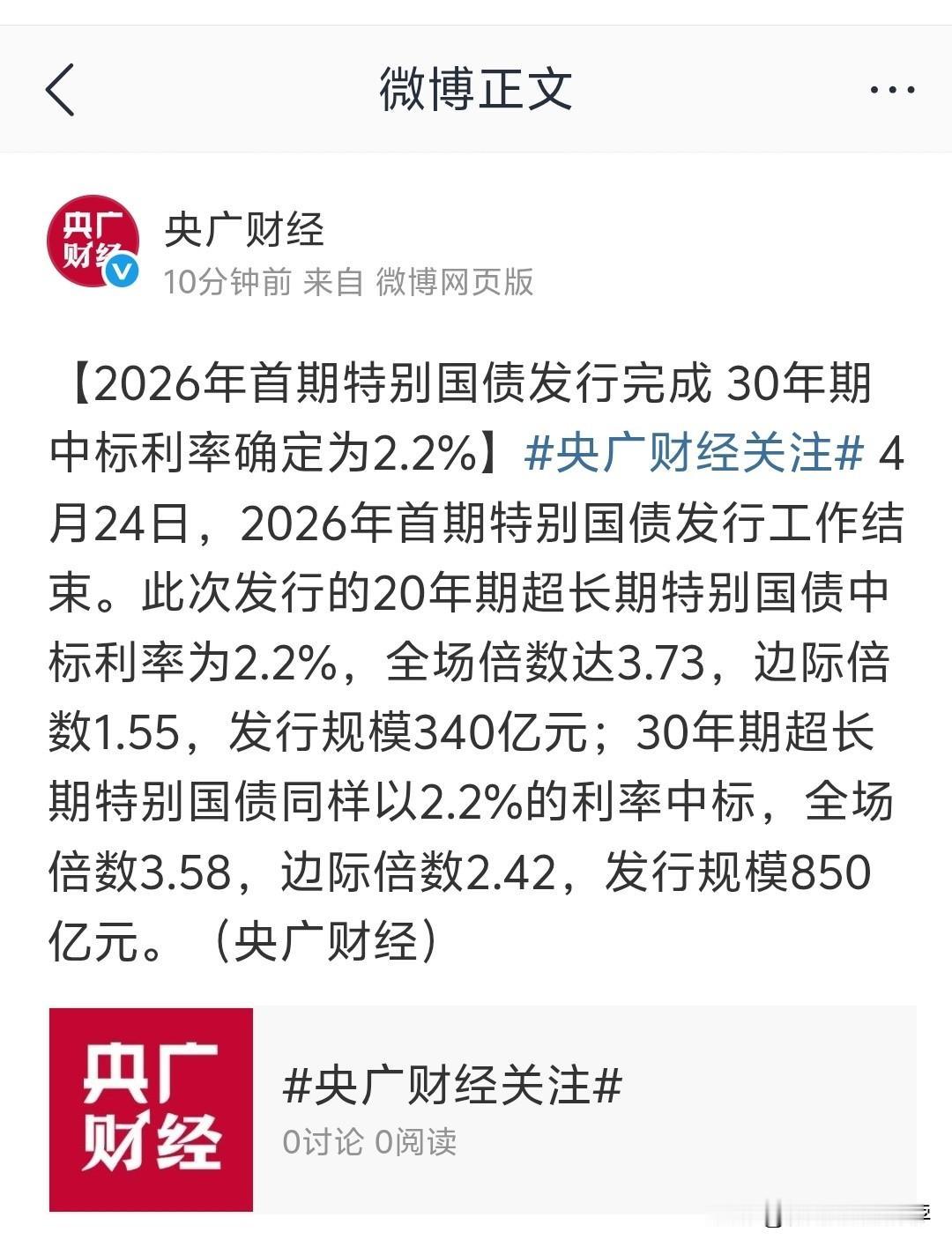 超长期特别国债昨天利率已经公布,20年期和30年期利率都是2.2%。