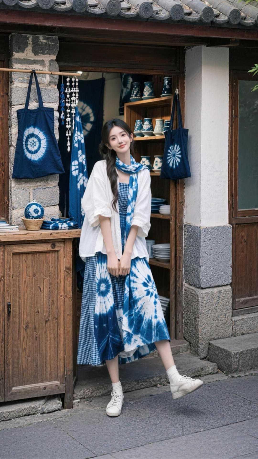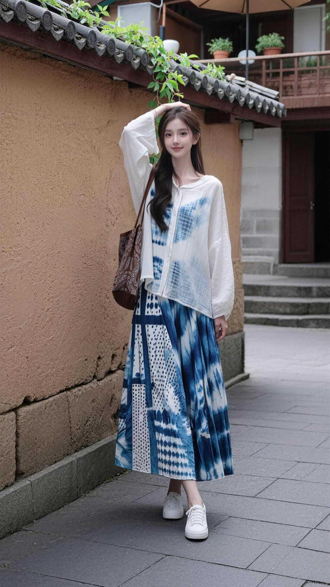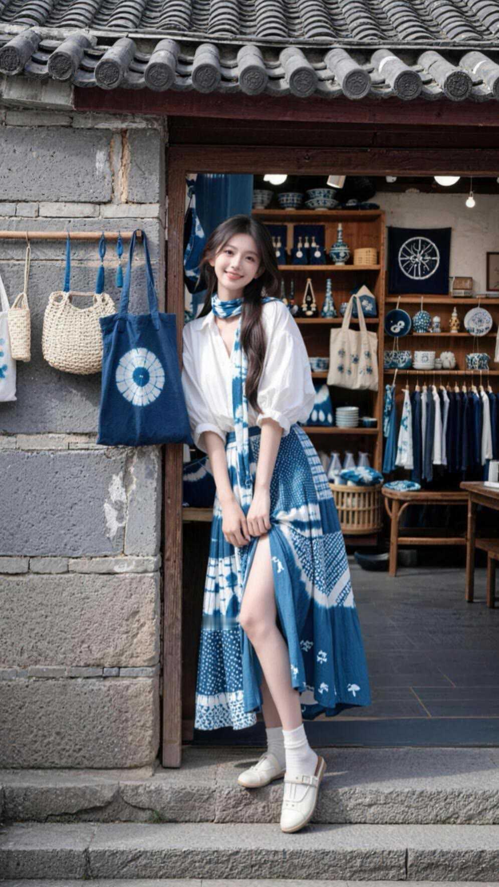 职场女性穿什么裙子好看?蓝白扎染半裙,适配职场与日常。宽松白衬衫外搭,清爽透气。
