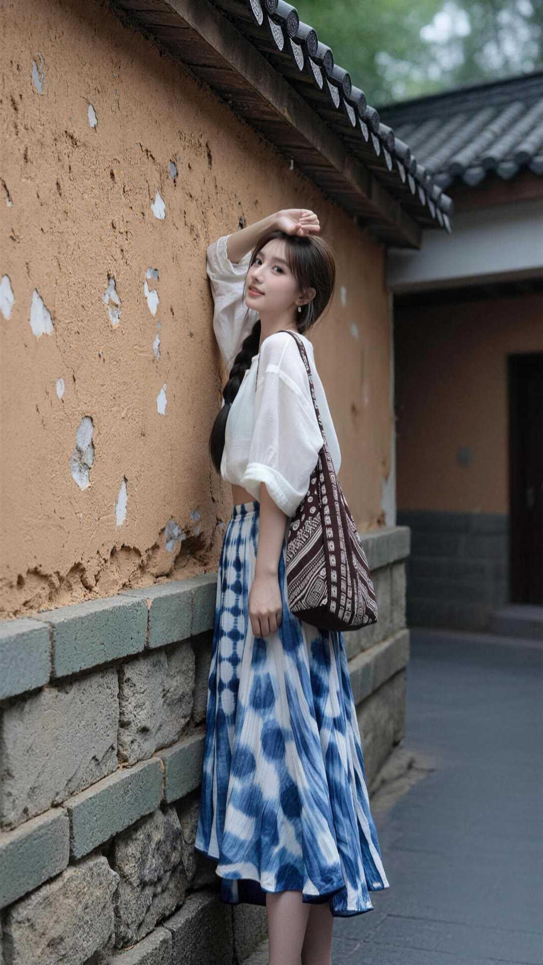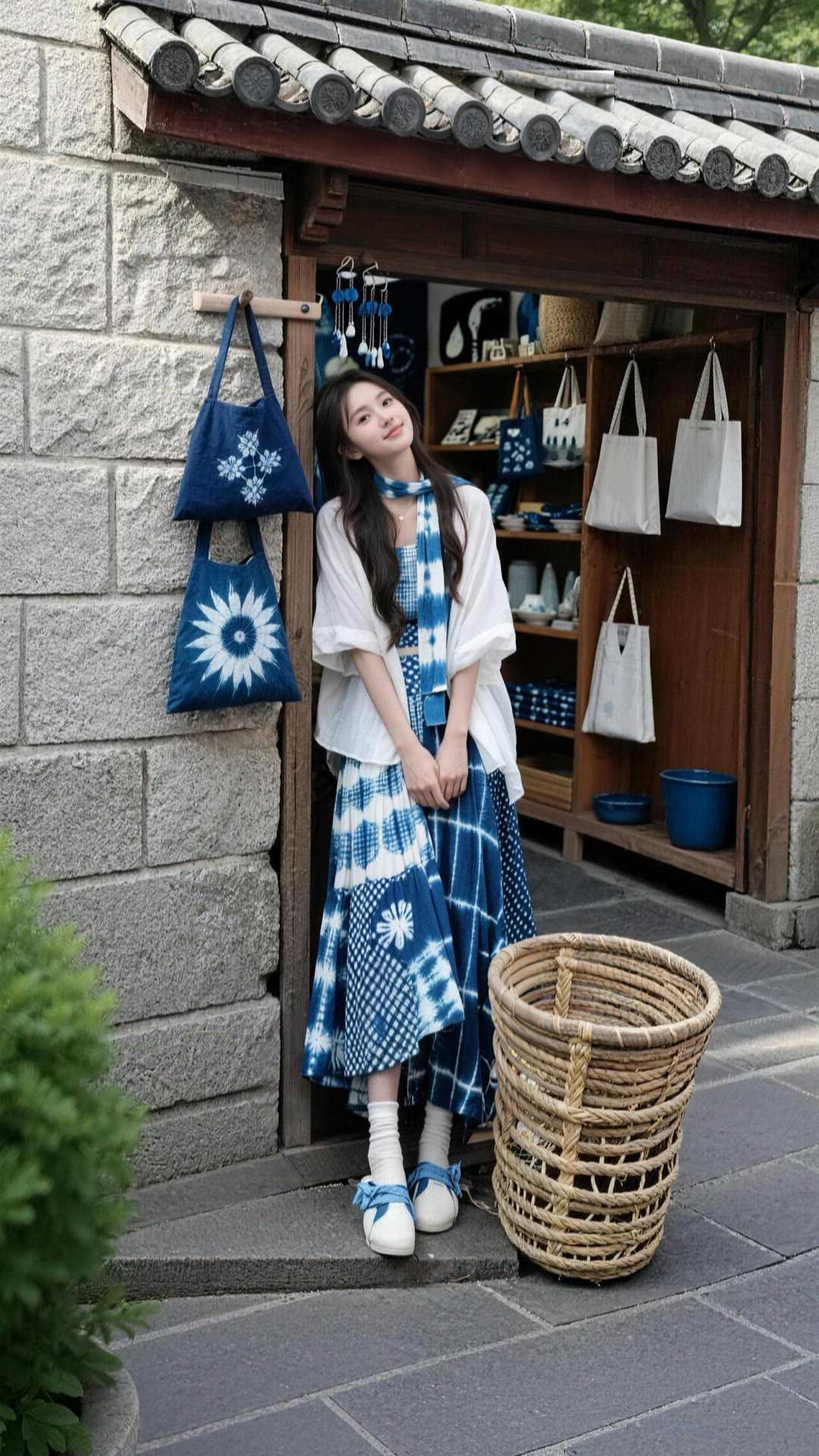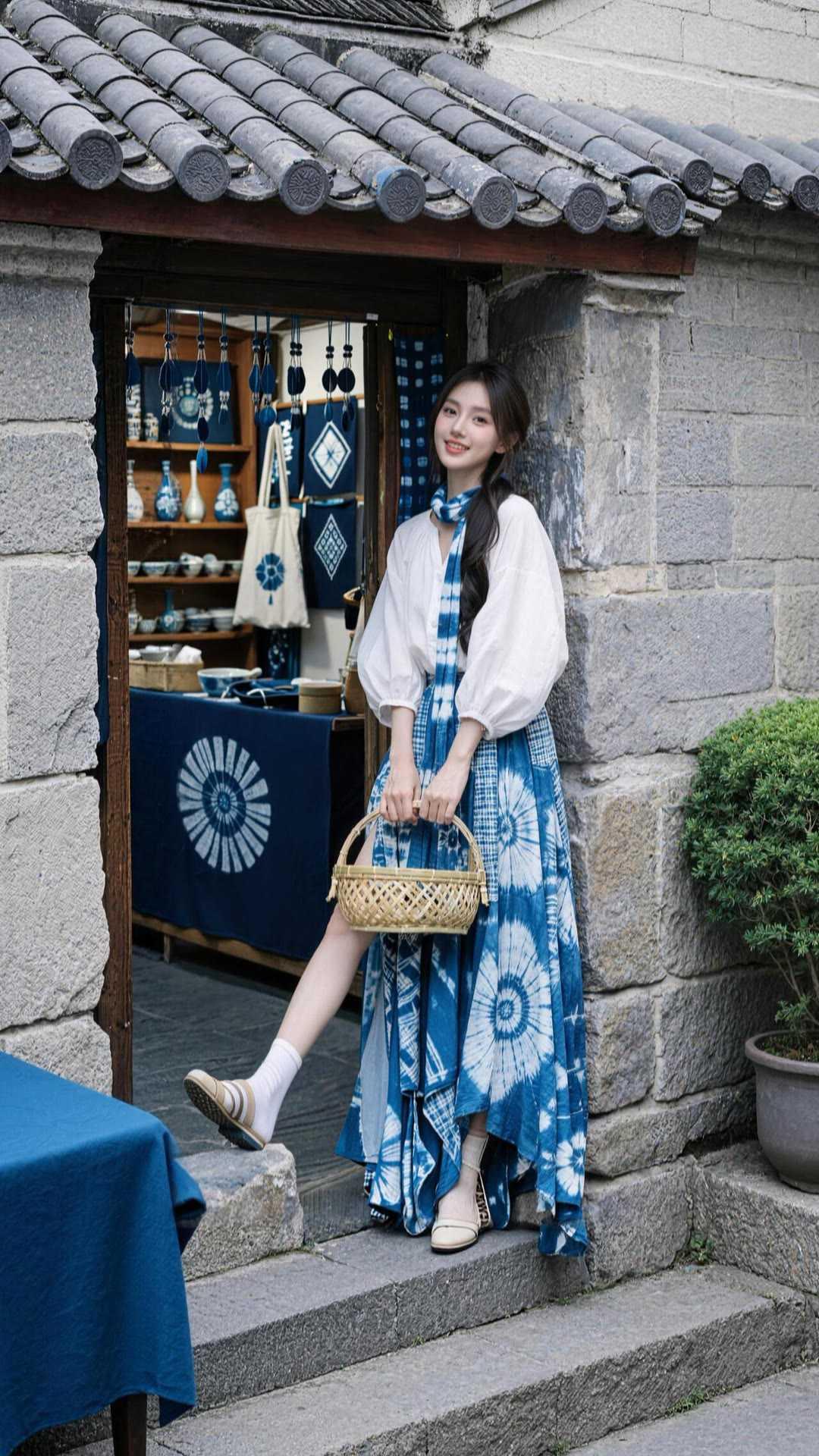 职场女性穿什么裙子好看?蓝白扎染半裙,适配职场与日常。宽松白衬衫外搭,清爽透气。
