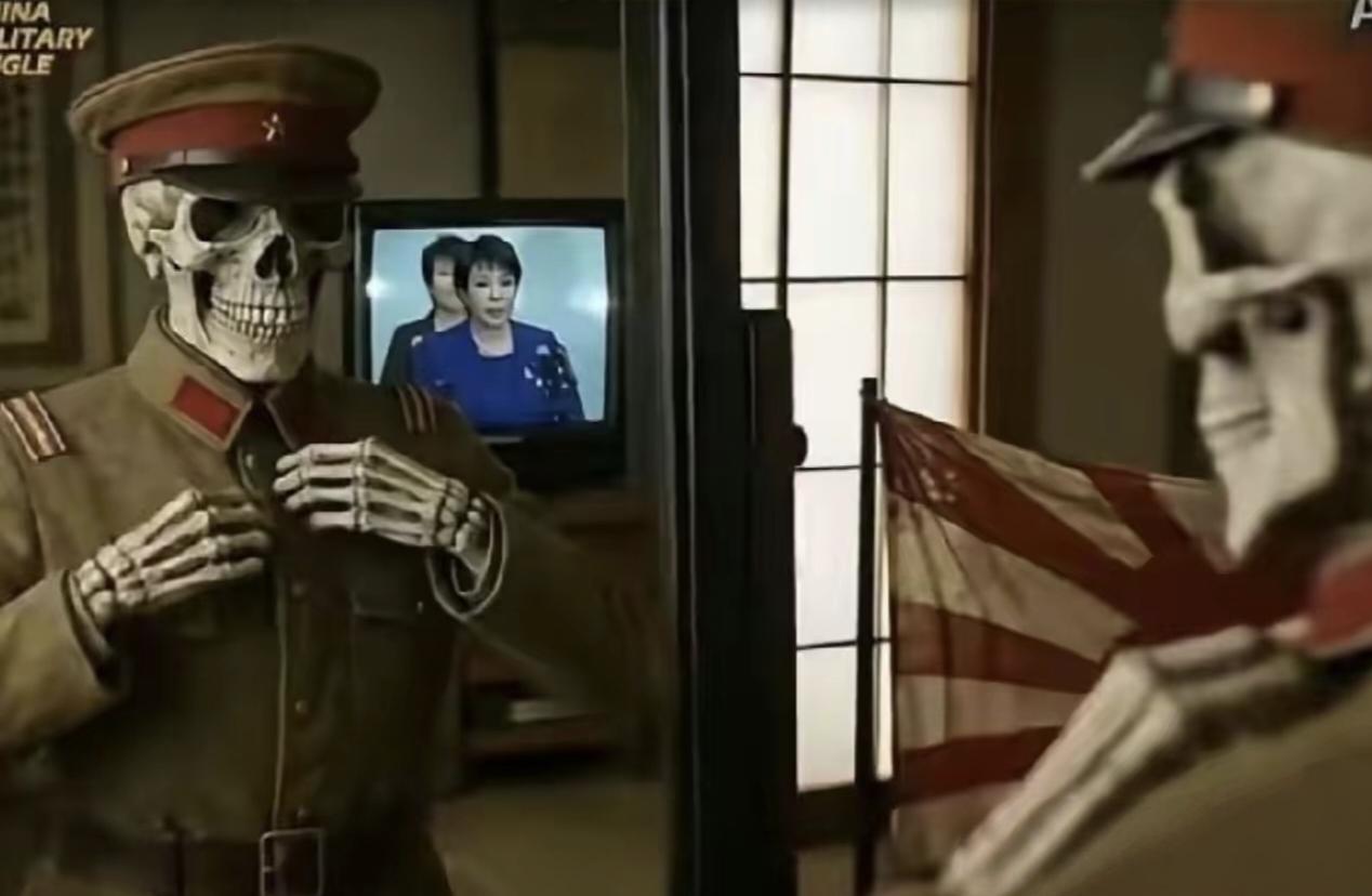 视频里每一个镜头都在戳破谎言:自卫队人员持刀闯使馆、“雷”号驱逐舰过航台海、高市早苗以首相名义向靖国神社献祭品、修改防卫装备转移三原则……这些近一个月里日本右翼狂飙突进的恶行,被一一钉在耻辱柱上。