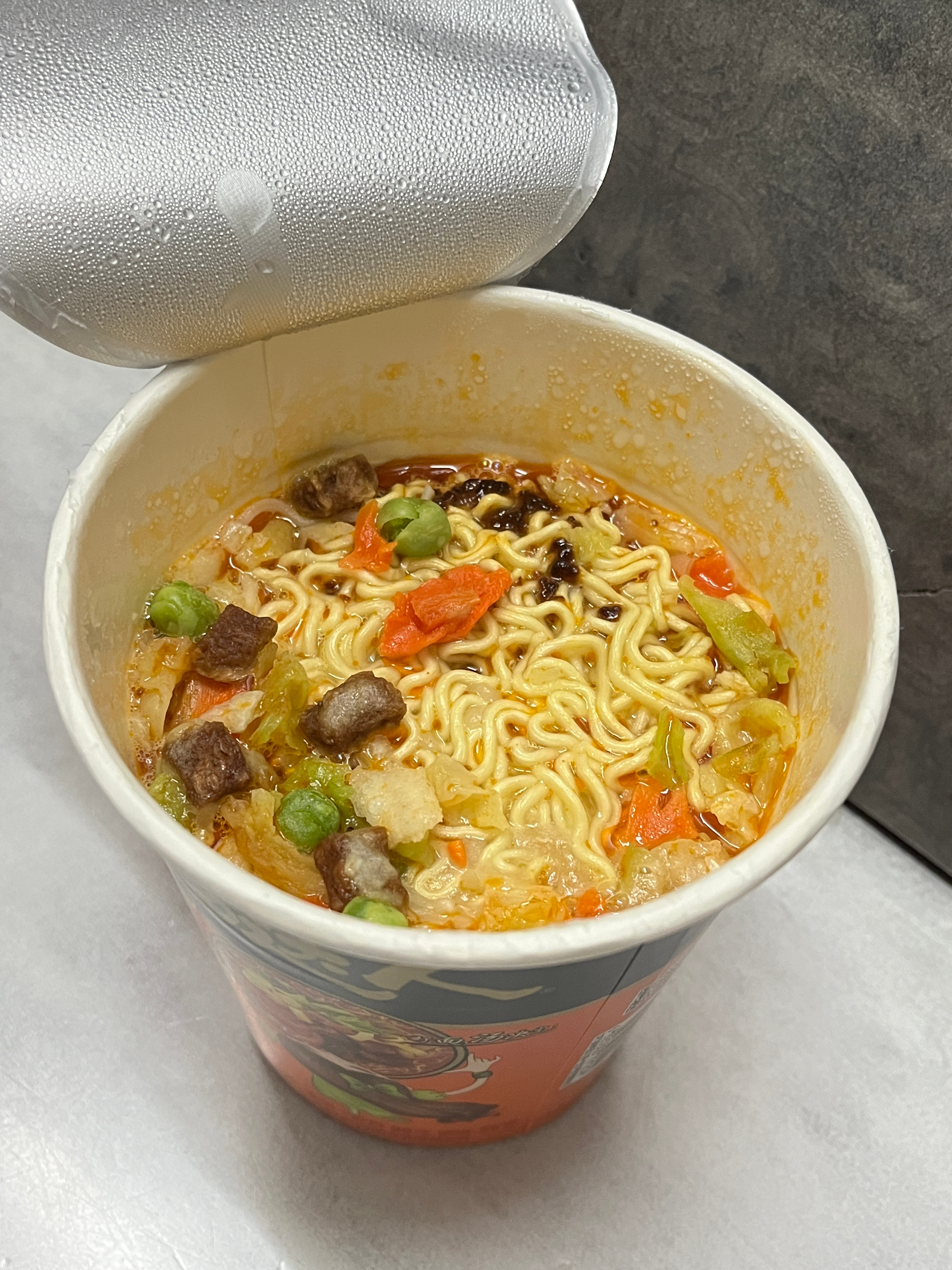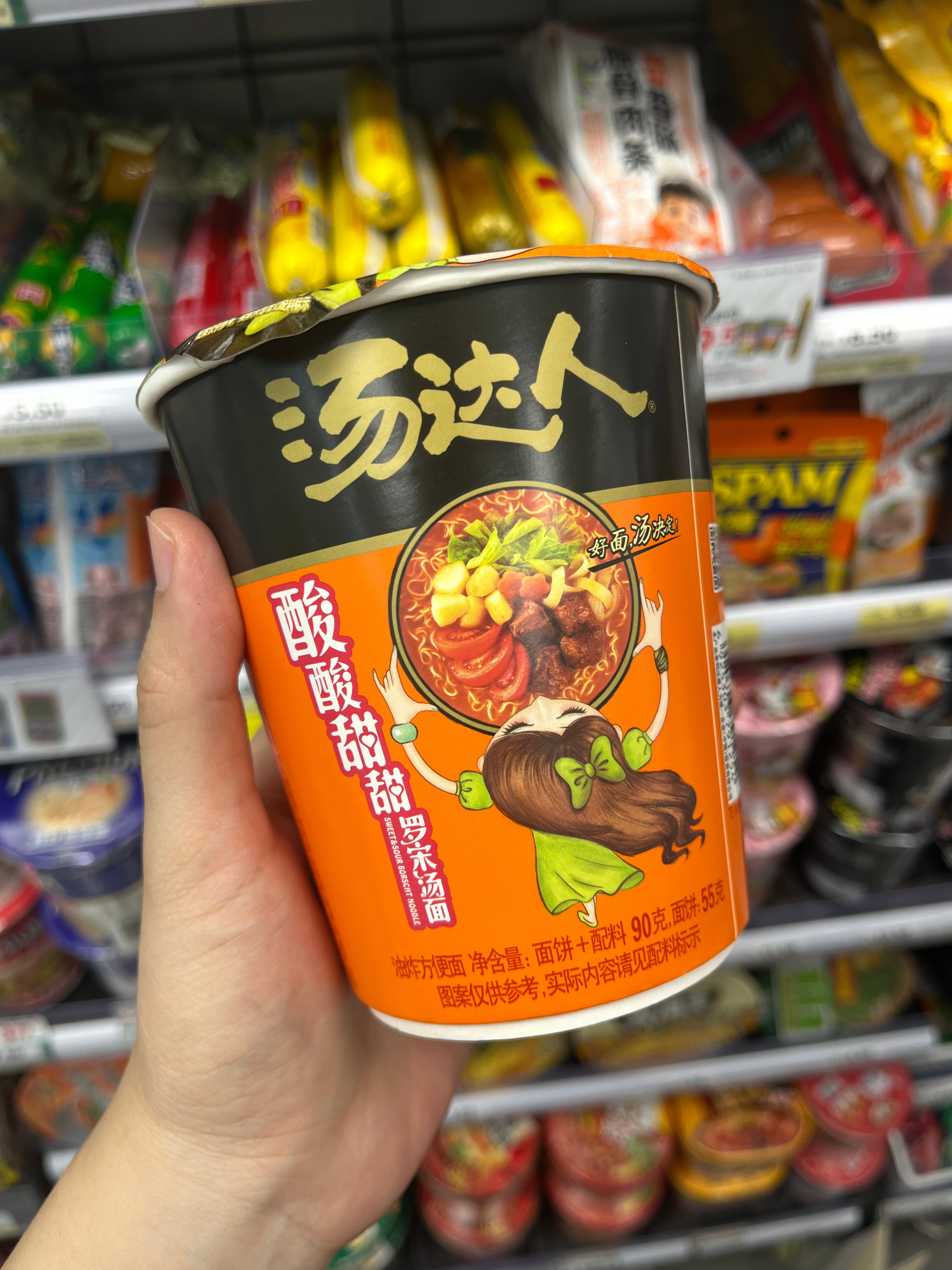 汤达人罗宋汤面🍜▷面条爽滑劲道,泡久了也还很有韧劲,喜欢硬一点口感的吃这个不错▷罗宋汤底能喝出牛骨汤味,总体酸酸甜甜的,不辣,蛮好喝的▷菜包有青豆、包菜和胡萝卜,牛肉粒都好厚