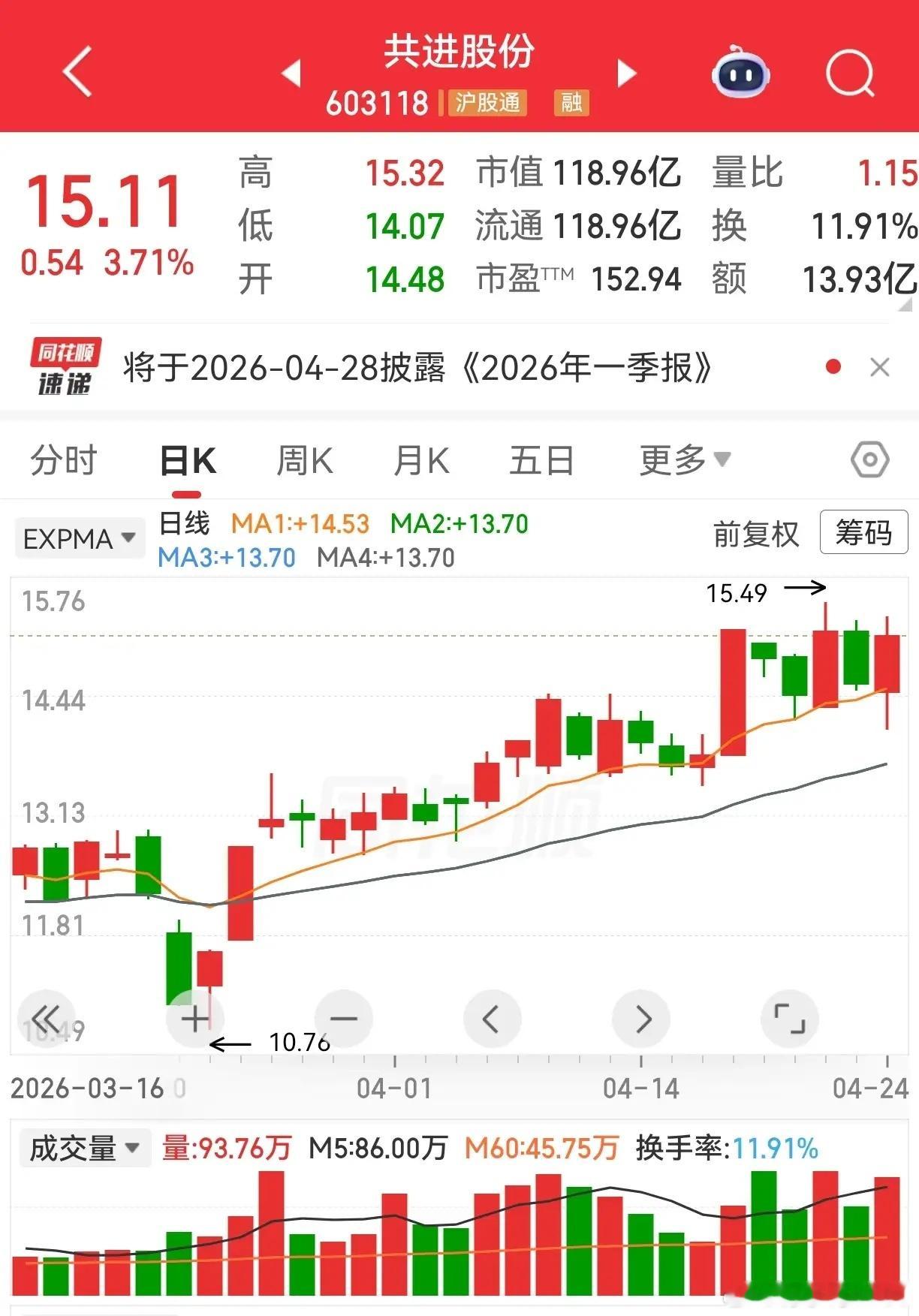 恒润股份和共进股份,这两个走势有没有一点相似。恒润股份,涨停板后,横向震荡整理了六天,周五长下影线,涨3.8%,近几天四阳夹一阴叠加长腿揉搓线。共进股份,涨停板后,横向震荡整理了五天,两阳夹一阴,紧贴生命线。看走势形态,近三天都是两阳夹一阴,不同之处是涨停板后和两阳夹一阴之接,恒润股份回调三天,共进股份回调两天。如果让你判断,哪一个好一些?