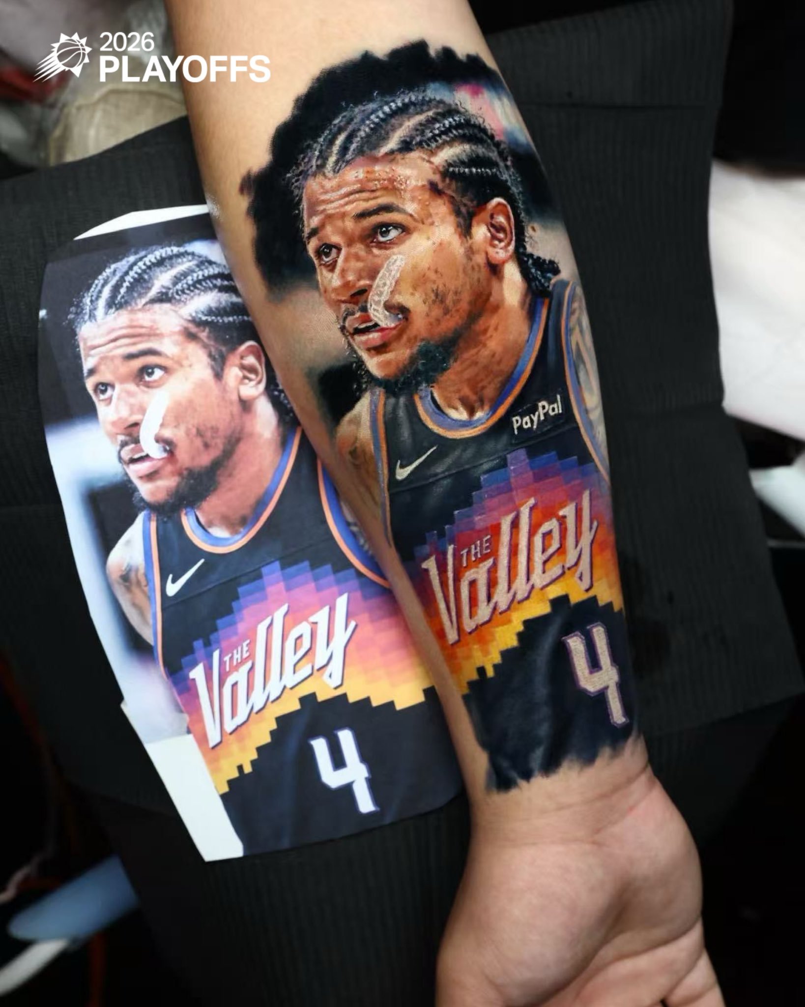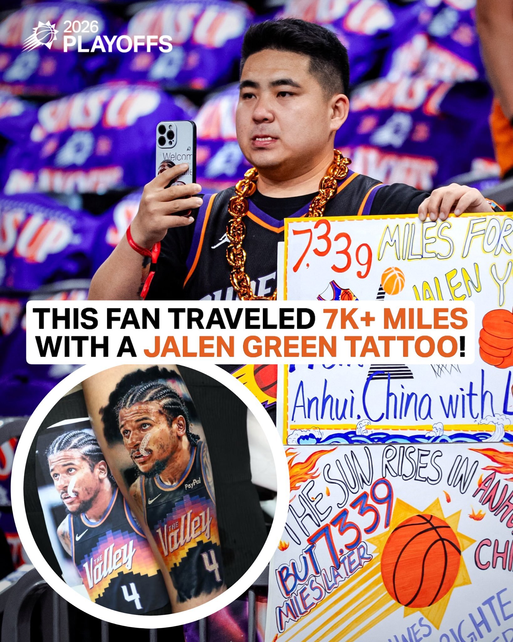 哇丢这是一位来自安徽的球迷,不远万里去太阳队主场为杰伦·格林助威加油,助威牌特意
