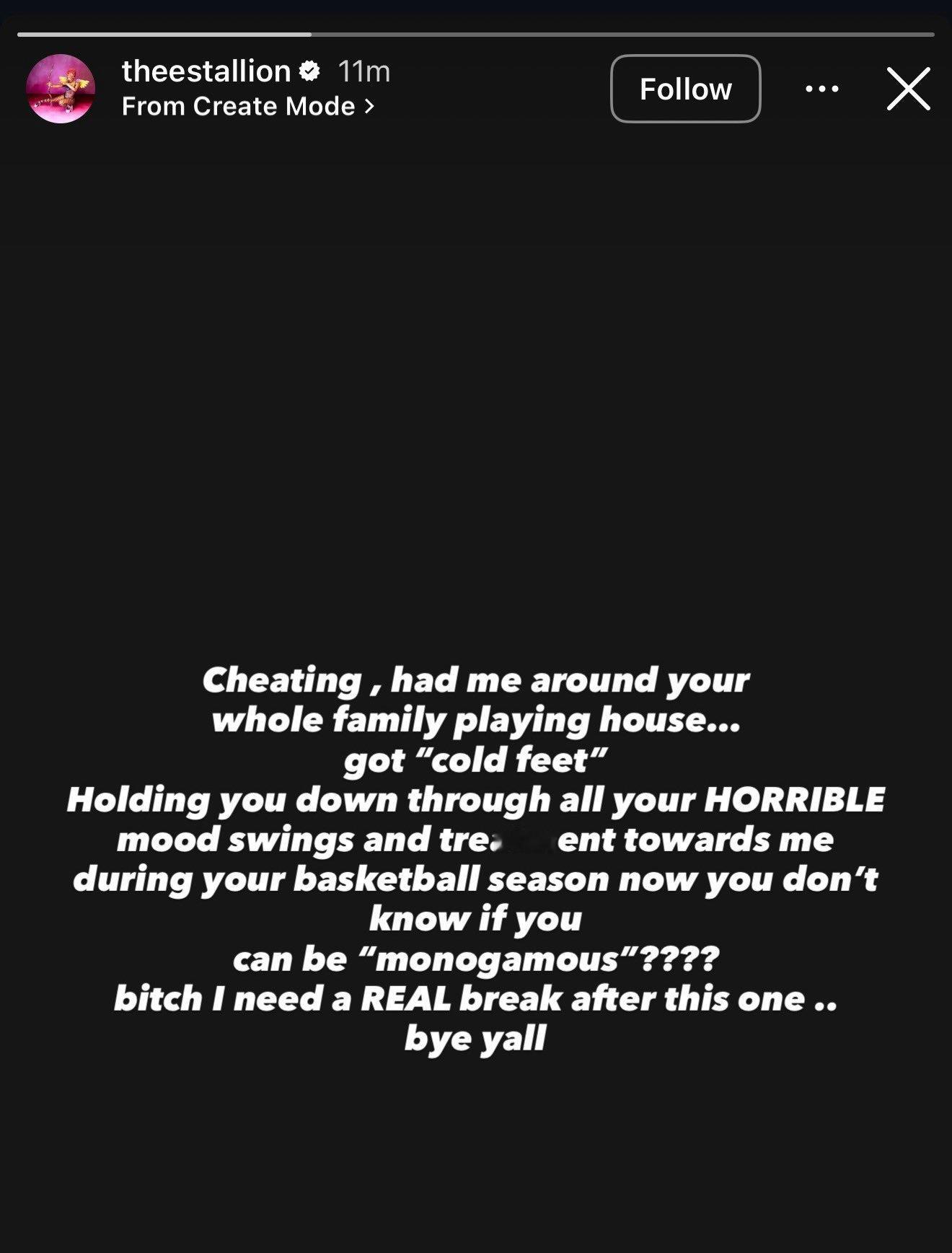 梅根·西·斯塔莉安在IG上指控克莱·汤普森出轨 “出轨,还让我在你全家面前扮贤妻良母过日子……结果你‘临阵退缩’了。你打篮球赛季时那些糟糕的情绪波动和对待我的方式,我都忍下来了。现在你跟我说你不知道自己能不能‘专一’???MD,这回我真需要好好歇歇了……再见吧各位。”