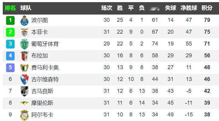 葡超现在是榜首球队直接晋级欧冠正赛,第二名打欧冠最后一轮资格赛,第三名只能打欧联杯。本菲卡还有最后3轮比赛,就看葡体最后5场里会不会掉链子,本菲卡先赛2场,领先葡体4分,但净胜球葡体是葡超最多的,他们达到55球,而本菲卡和波尔图只有47个。