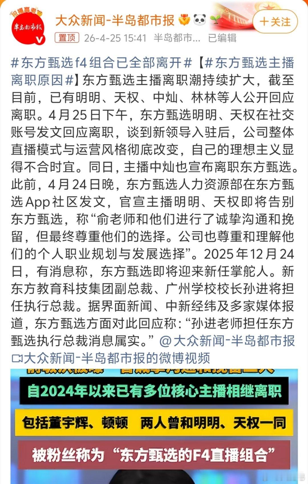 东方甄选主播离职原因 估计还是有什么愤怒的地方。F4当天全部离职多多少少是带着一