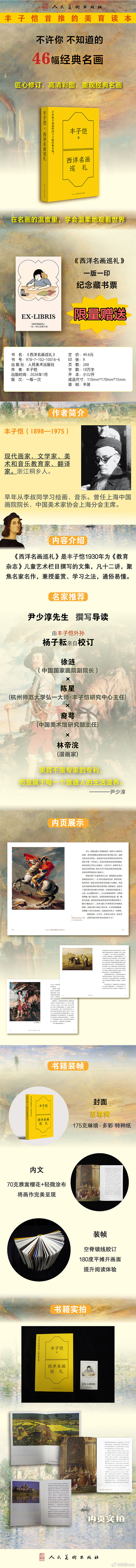 1.丰子恺首推的美育读本;2.由丰子恺外孙杨子耘先生亲自校订,自1931年初版以来,首次以高清彩图重现经典;3.本书由尹少淳先生撰写导读,陈星(弘一大师·丰子恺研究中心主任)×徐涟(中国国家画院副院长)×裔萼(中国美术馆展览部主任)×林帝浣(漫画家)等人诚意推荐。3.依据原版中提及的24幅插图,此次再版以彩图形式重现22幅作品,并补充24高清彩图,重现经典;4.《西洋名画巡礼》并非一部高深莫测的艺术史专著,也不是堆砌术语、炫耀学识的学术论文;它更像是一位温厚、平和而智慧的长者,娓娓道来那些遥远国度里的艺术故事。正是这种平实而有趣的叙述方式,使《西洋名画巡礼》成为美育大众化时代的一盏明灯。——尹少淳(首都师范大学美术学院教授、博士生导师,教育部艺术教育委员会委员、教育部高等院校美育教学指导委员会委员、中国美术家协会少儿美术艺术委员会名誉主任。)