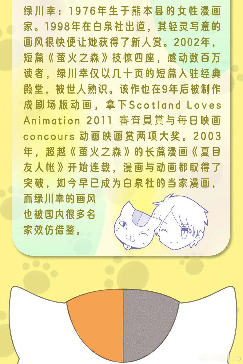金筑顺子老师此次能帮忙创作《夏目友人帐》的轻松四格漫,我感到非常开心!平时一脸严肃、不苟言笑的角色在老师的塑造下,也变得可爱、灵动起来,看完后,我感到非常温暖和幸福。金筑顺子老师,感谢您的创作!