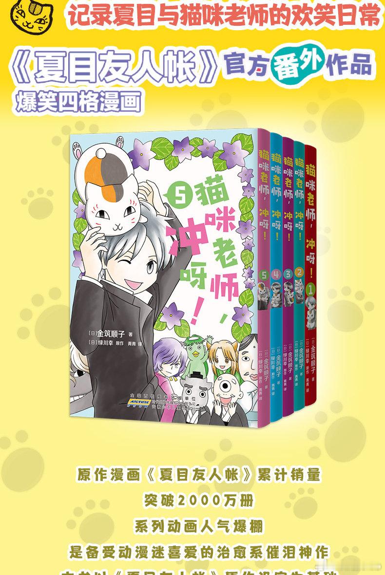 《夏目友人帐》是日本知名少女漫画出版社——白泉社的当家作品,风格温柔治愈,原作漫画现已发售32卷,系列动画已放送七季,是无数粉丝心中的经典佳作。《猫咪老师,冲呀!》是《夏目友人帐》新推出的官方番外漫画,共5卷,以搞笑四格漫的形式展现了别样的夏目故事,书中登场人物众多,为粉丝带来感动与欢乐。