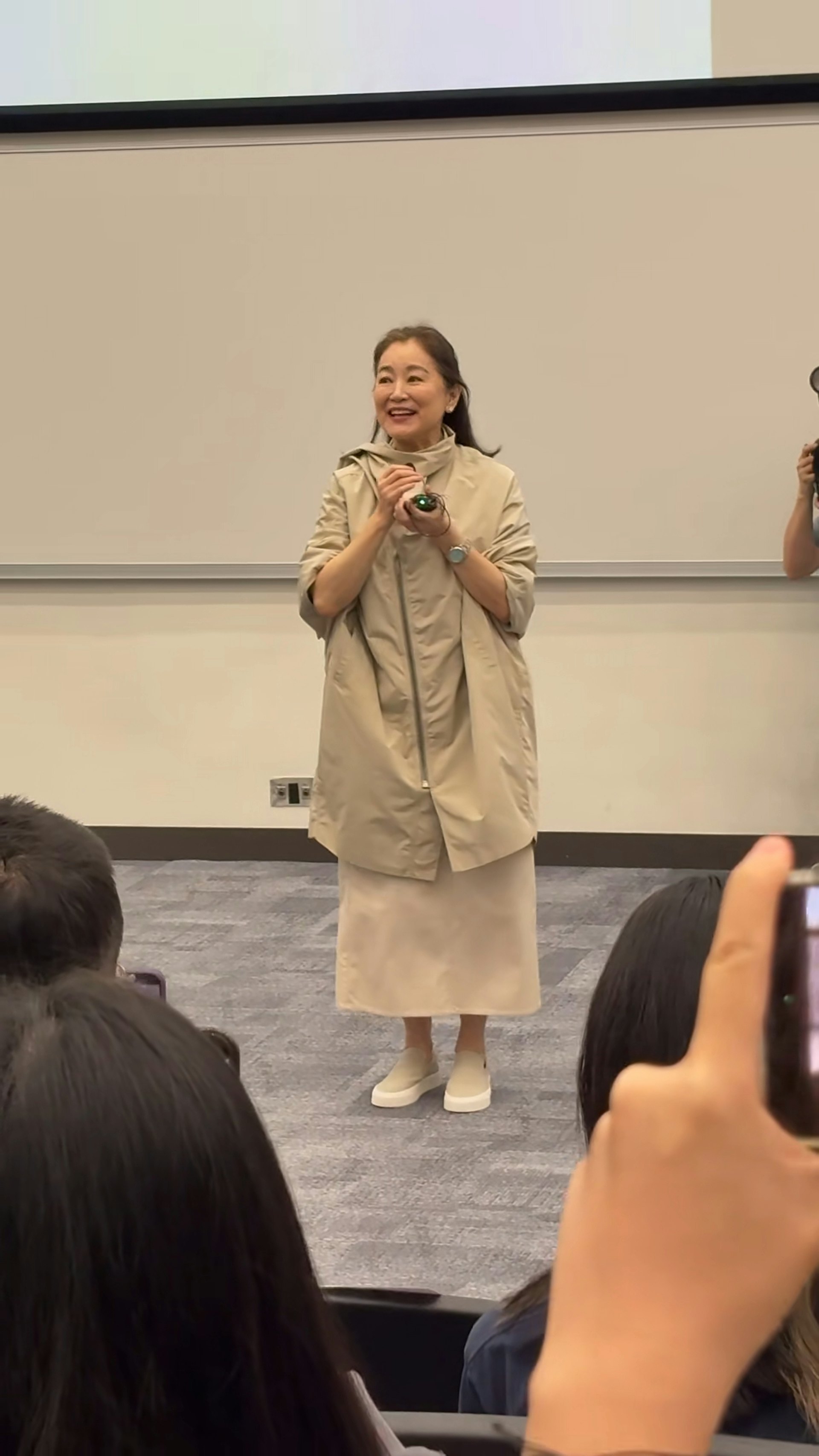 林青霞在香港中文大学参加活动,她坐在车上和粉丝招手,活动结束后在每个转播场地都去